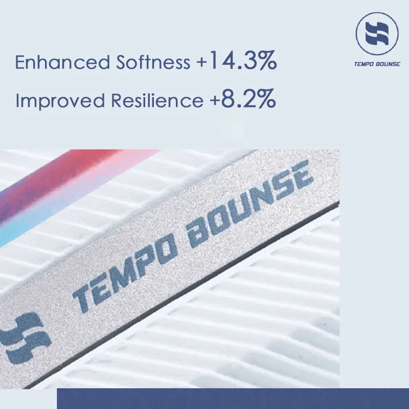 TEMPO BOUNSE: TEMPO BOUNSE is an outsole technology that seamlessly integrates the excellent properties of both the midsole and the outsole. In addition to the outstanding wear resistance and slip resistance , it is distinguished by its low density and high elasticity, which not only deliver remarkable traction capability but also a superior lightweight, soft, and bouncy wearing experience, as well as the powerful driving force.