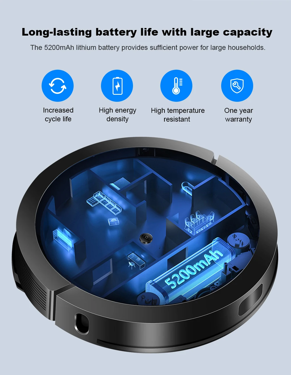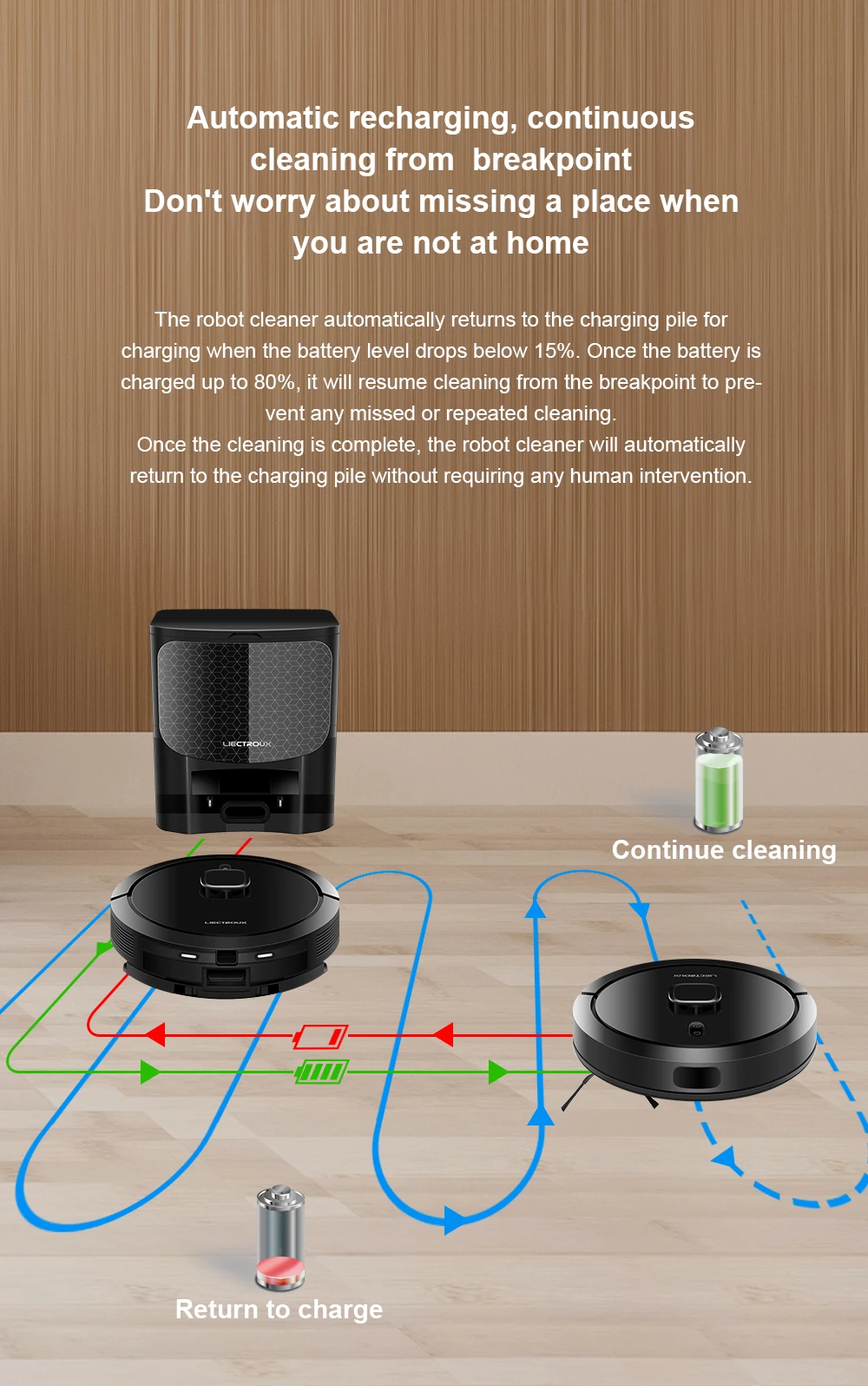 9.Breakpoint Resumable Cleaning. If the robot out of power, it will automatically recharge, fully charged and then go back to the interrupted place to continue cleaning. Rest assured, it will get the job done.