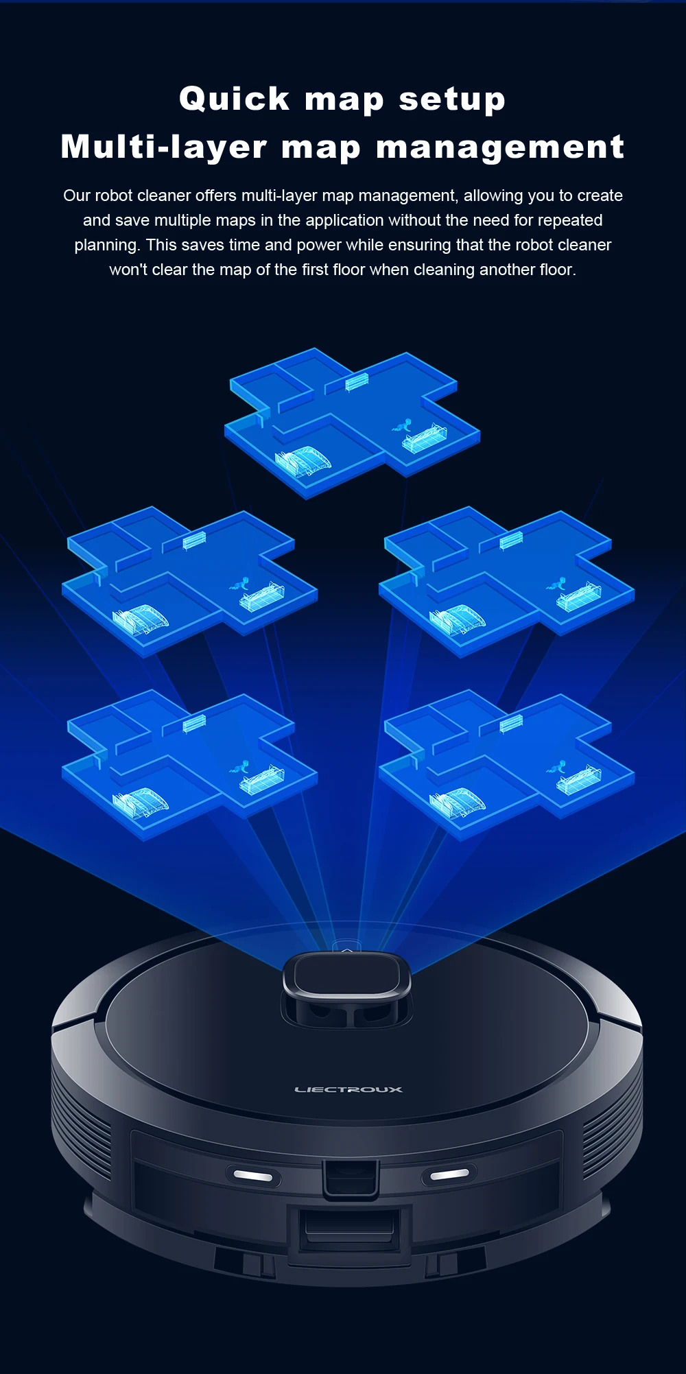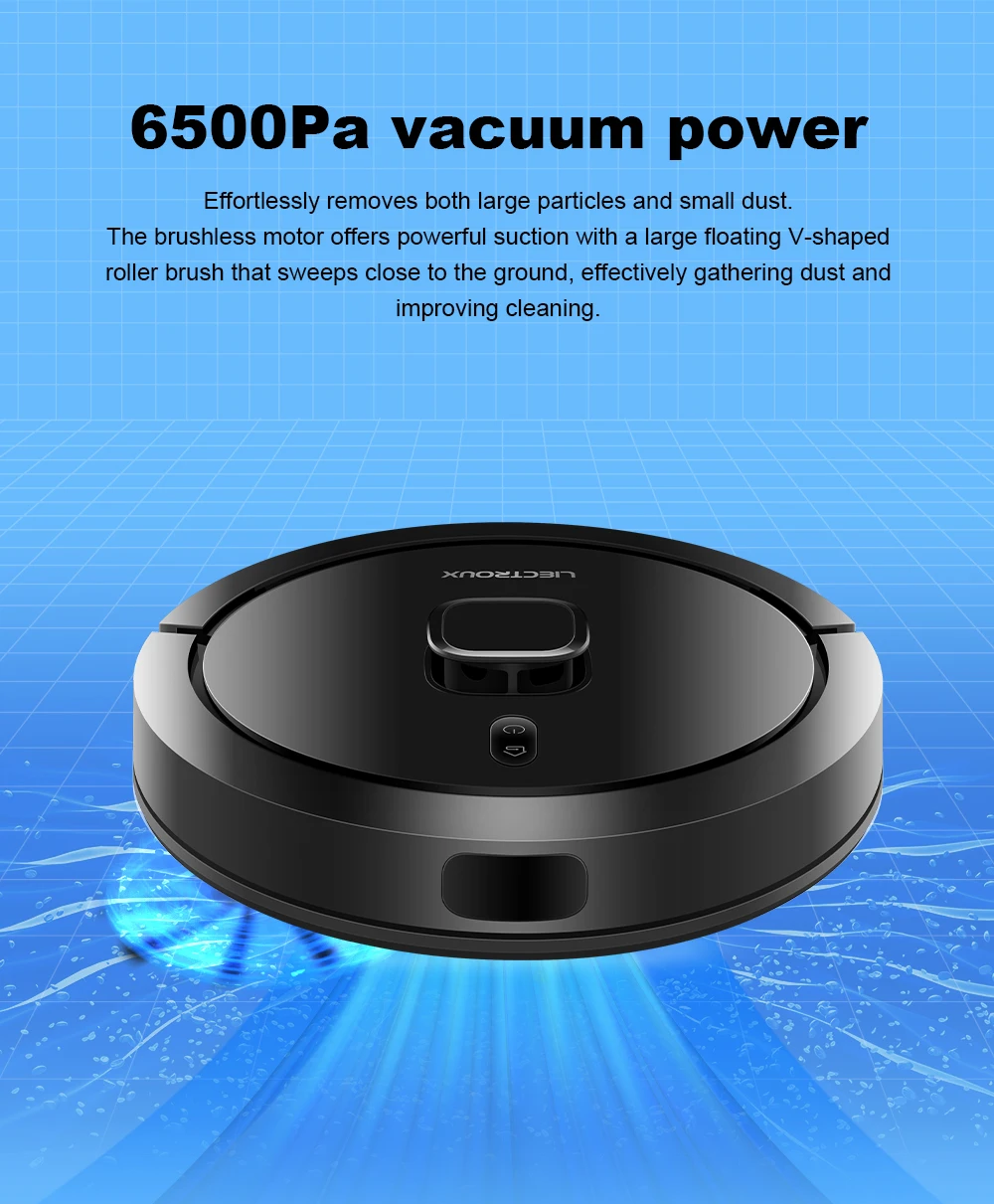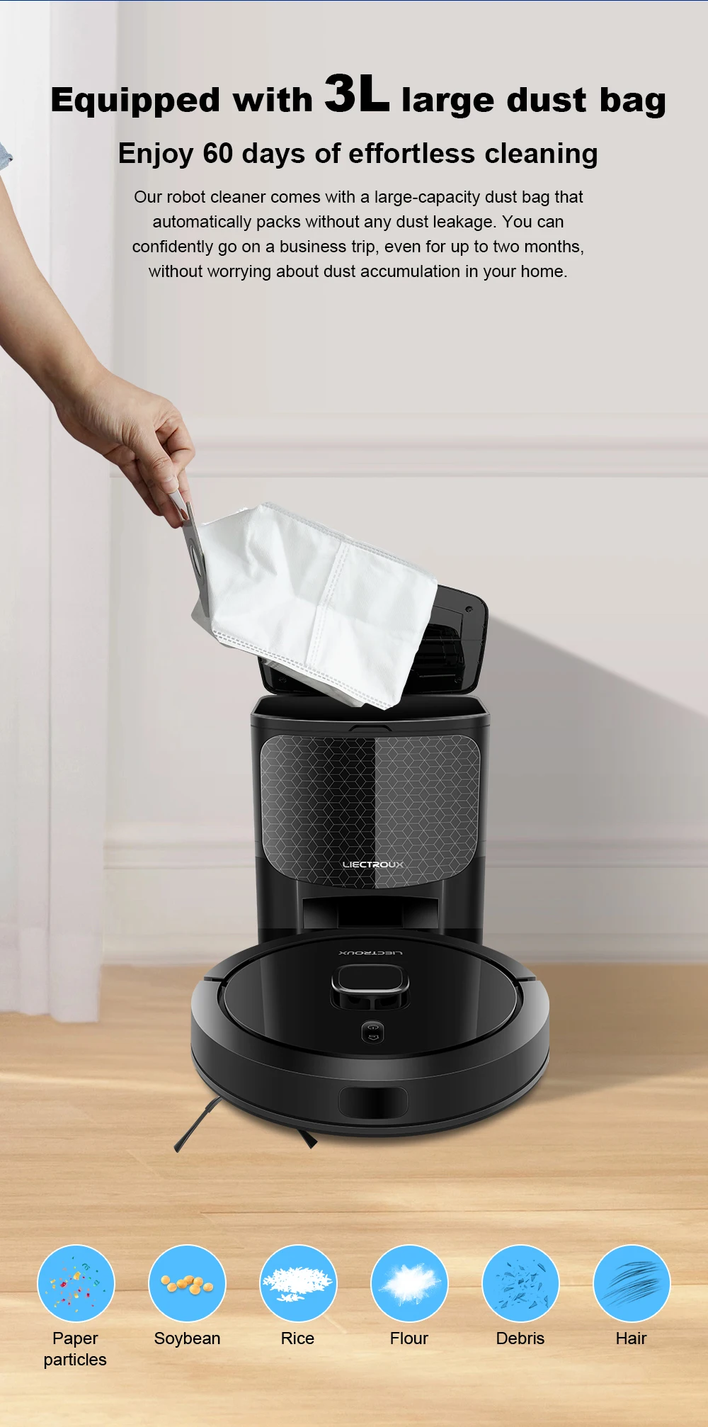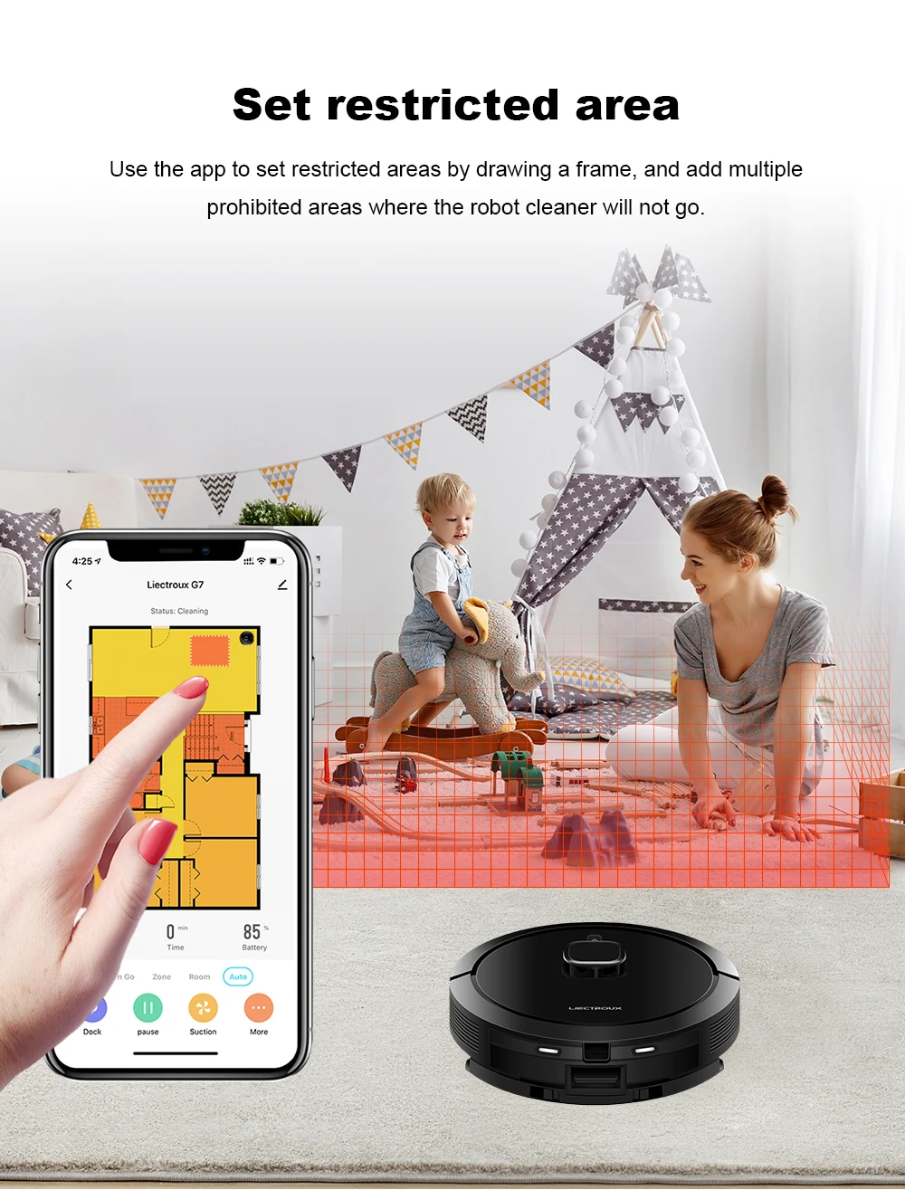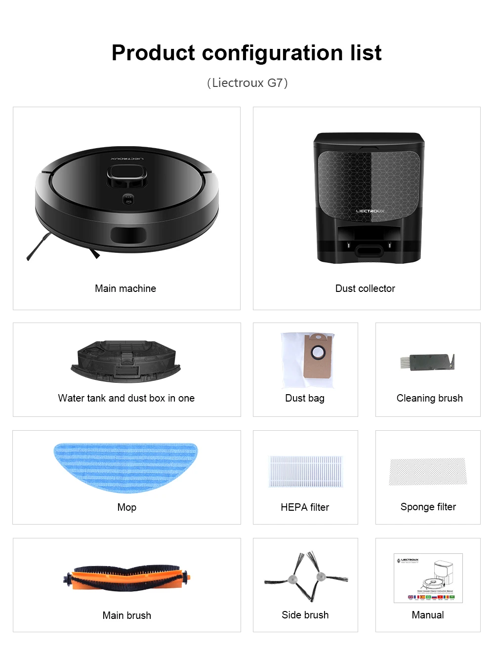 Product name: Liectroux G7 LDS Robot Vacuum Cleaner With Self-emptying Dustbin, Multi-floor Map Storage, Selective Room Clean, No go Zones, Breakpoint Resume Cleaning, 6.5KPa Suction, Vacuum and Mop Combo, Anti-corrosion Water Tank, Ultrasonic Carpet Recognition and Boost Technology, 5200mAh Battery, 180mins Runtime, 3L Dustbag, 60 Days Hassle-free