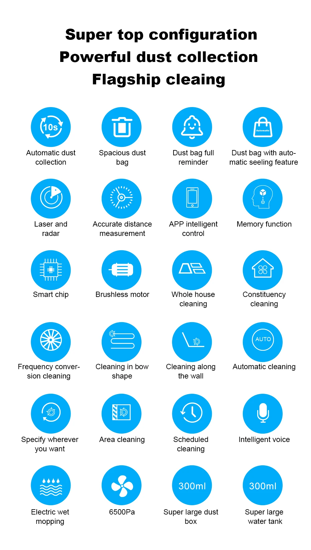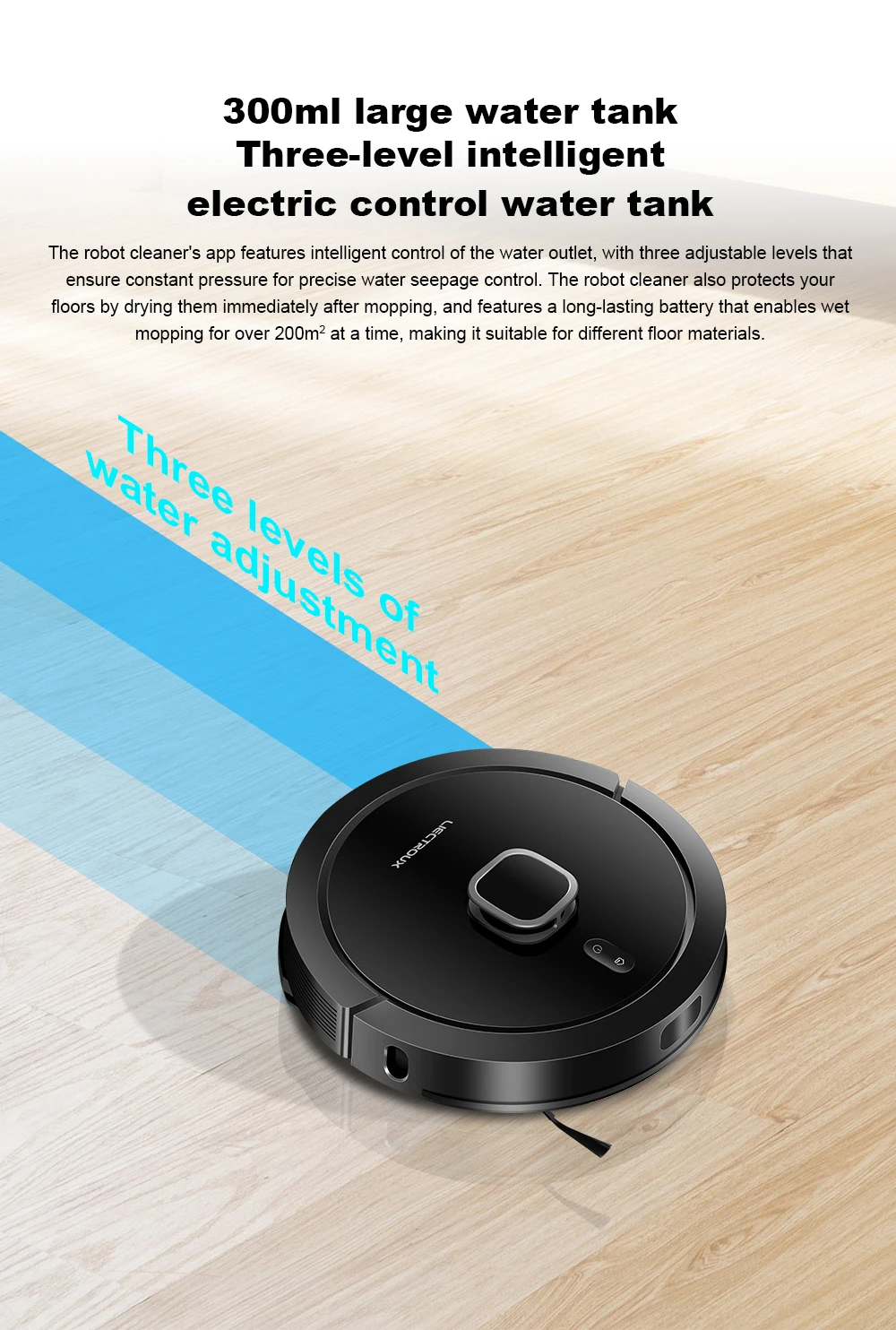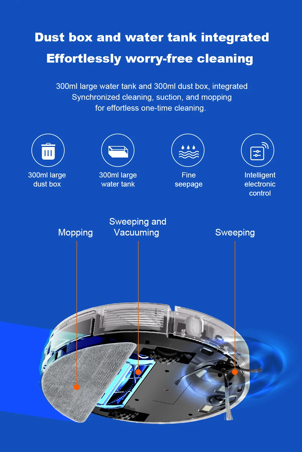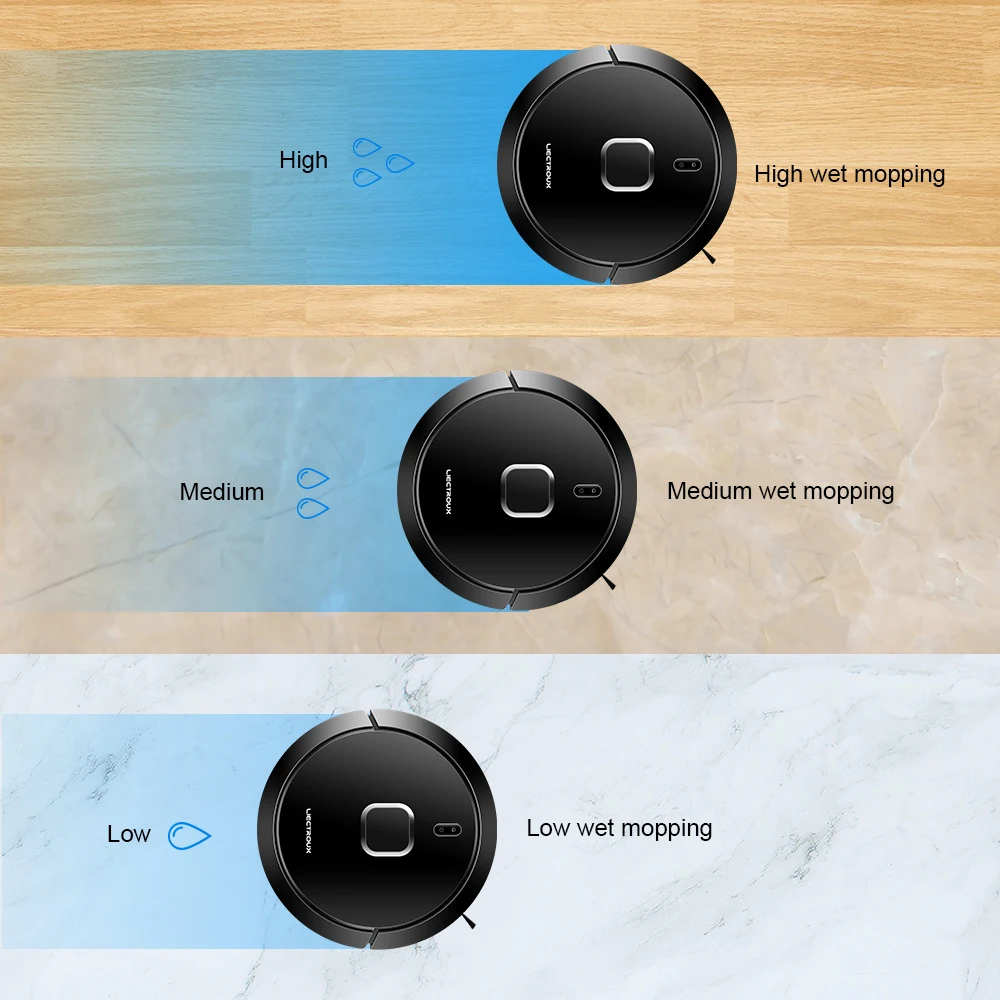 2.Unique wet mopping function: It adopts the latest method of mopping the floor, Y-shaped back and forth wiping, this make the deepest cleaning compared to other normal cleaning.And the robot equipped a large-capacity electronically controlled water tank, it can adjust the water output.