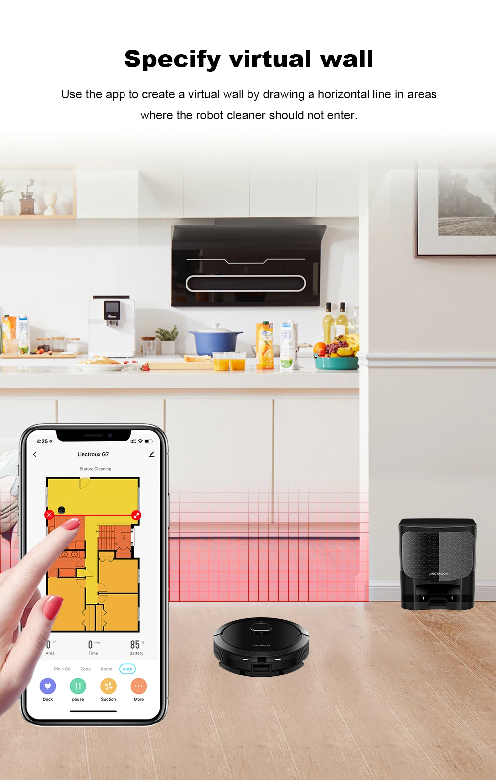 5.Virtual blocker and restricted area settings: You can draw a line or an area on the APP map to forbid the robot to pass through, by this way, you will not be disturbed to do other things.