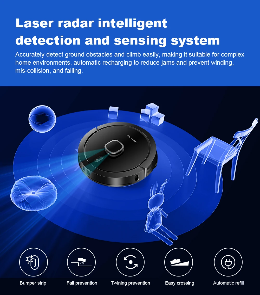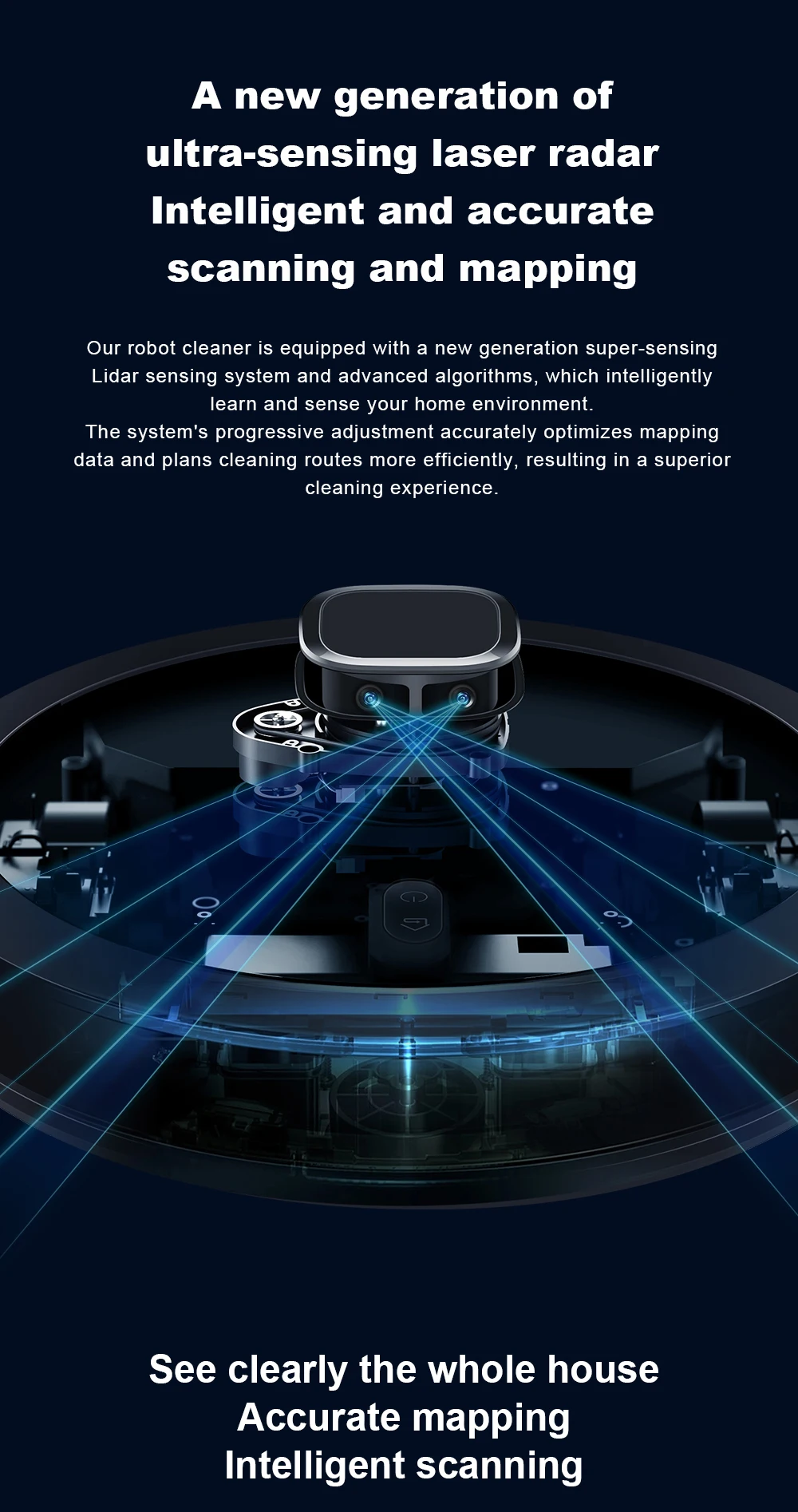 Equipped with a new LDS laser scanning system, the robot using SLAM algorithm and signal acquisition system, it can quickly rotate to scan the home environment, to make the mapping more precise and the image storage more stable.