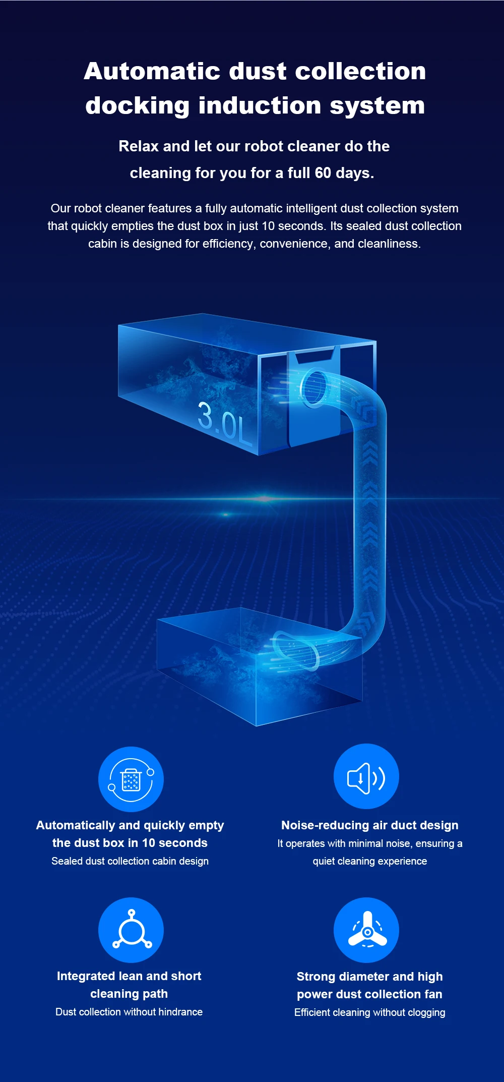 3.The machine can automatically collect dust. After the work is over, the sweeper will return to the charging base, and the garbage will be automatically collected into the dust bag, which is very convenient. You don’t have to sweep and clean up the garbage once.