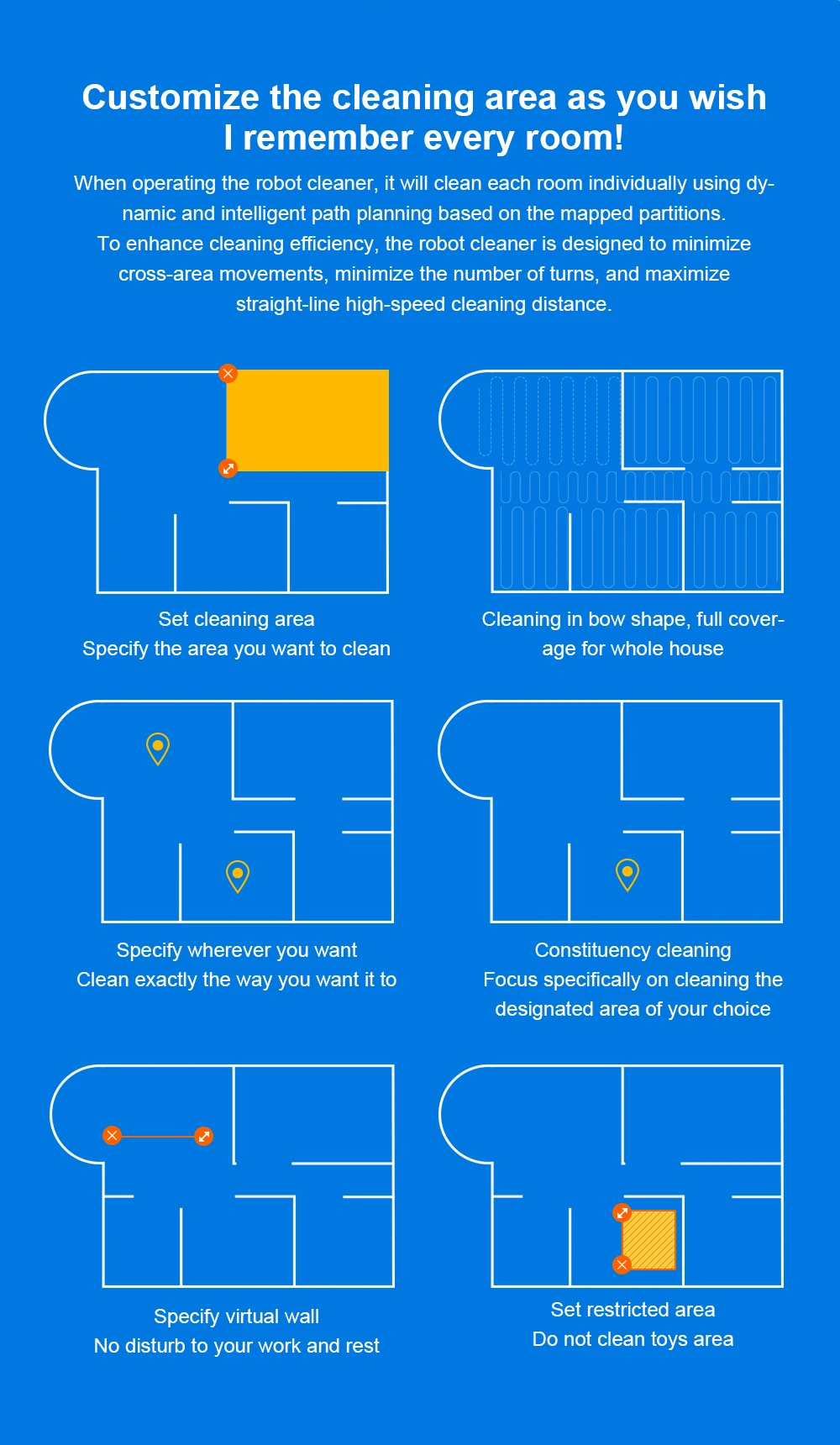 4.Intelligent partition cleaning: You can use the APP to name each area and assign the robot to a specific place to clean. It can also be cleaned in a certain time, which is super convenient.
