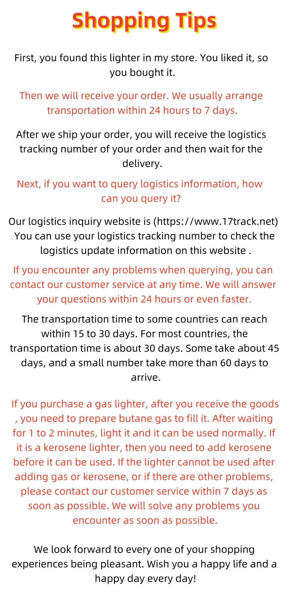 ►If there is a problem with the lighter you received, or you did not receive a lighter, then please contact me first, I will give you a satisfactory answer. Thank you for coming and wish you a happy life.