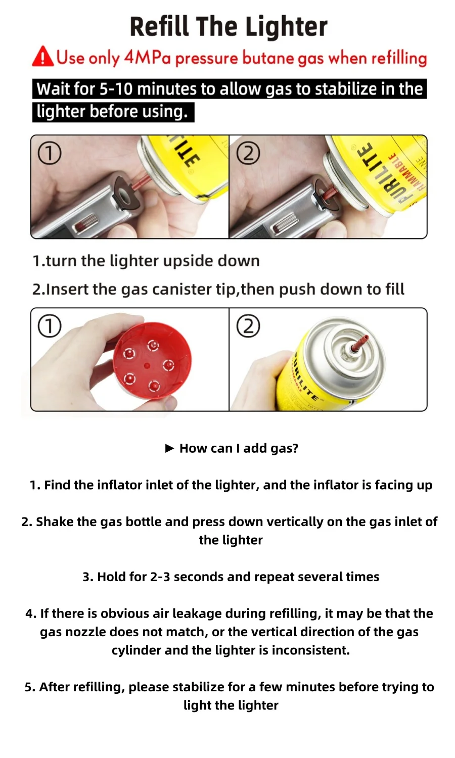 5. After refilling, please stabilize for a few minutes before trying to light the lighter