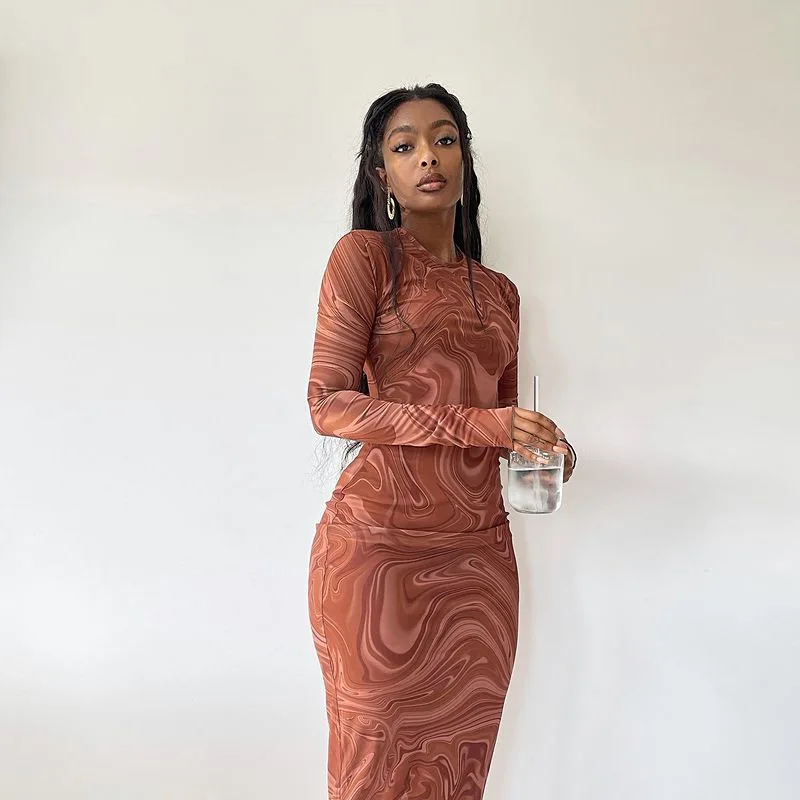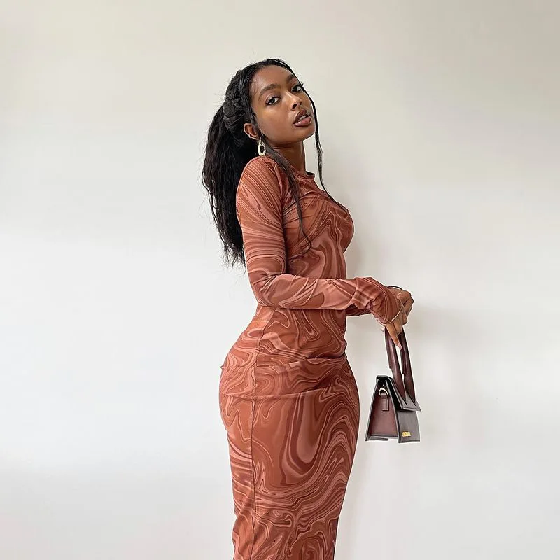 Long Sleeve Bodycon Dresses For Women Evening Party Clothes O-neck Mid Calf Sexy Vestidoes De Mujer One Piece Outfits Streetwear