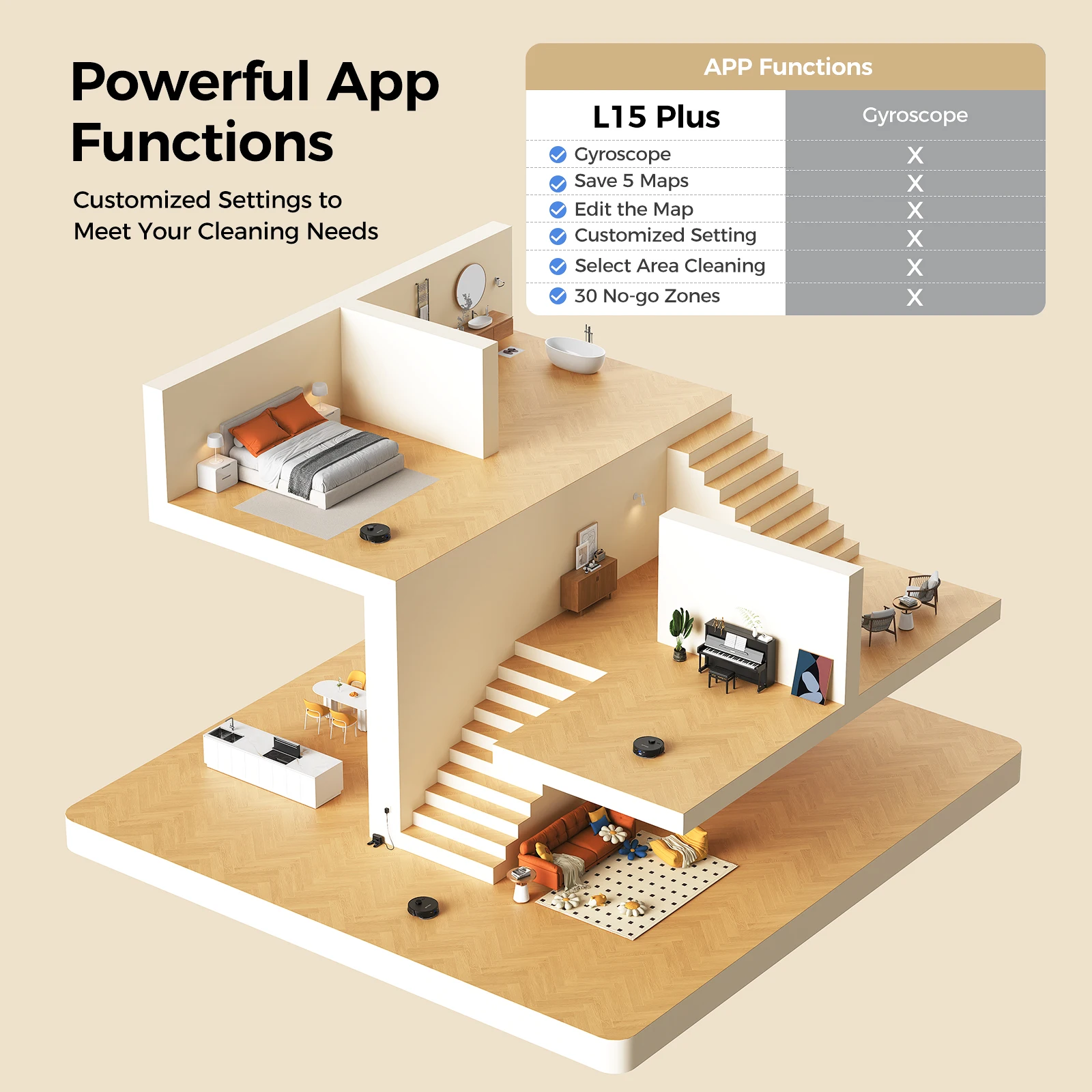 【5000Pa Ultra-Strong Suctio】The L15Plus Robot Vacuum Cleaner is equipped with Japanese BIDC motor, high-speed brushless motor and provides 4 adjustable 5000pa super suction power to sweep away dust in crevices, edges and corners,as well as dirt on carpets. When a carpet is detected, it automatically increases the suction power to the maximum for deeper cleaning.Robot vacuum suitable for lots of surfaces, hard floors, wooden floors, carpet,etc