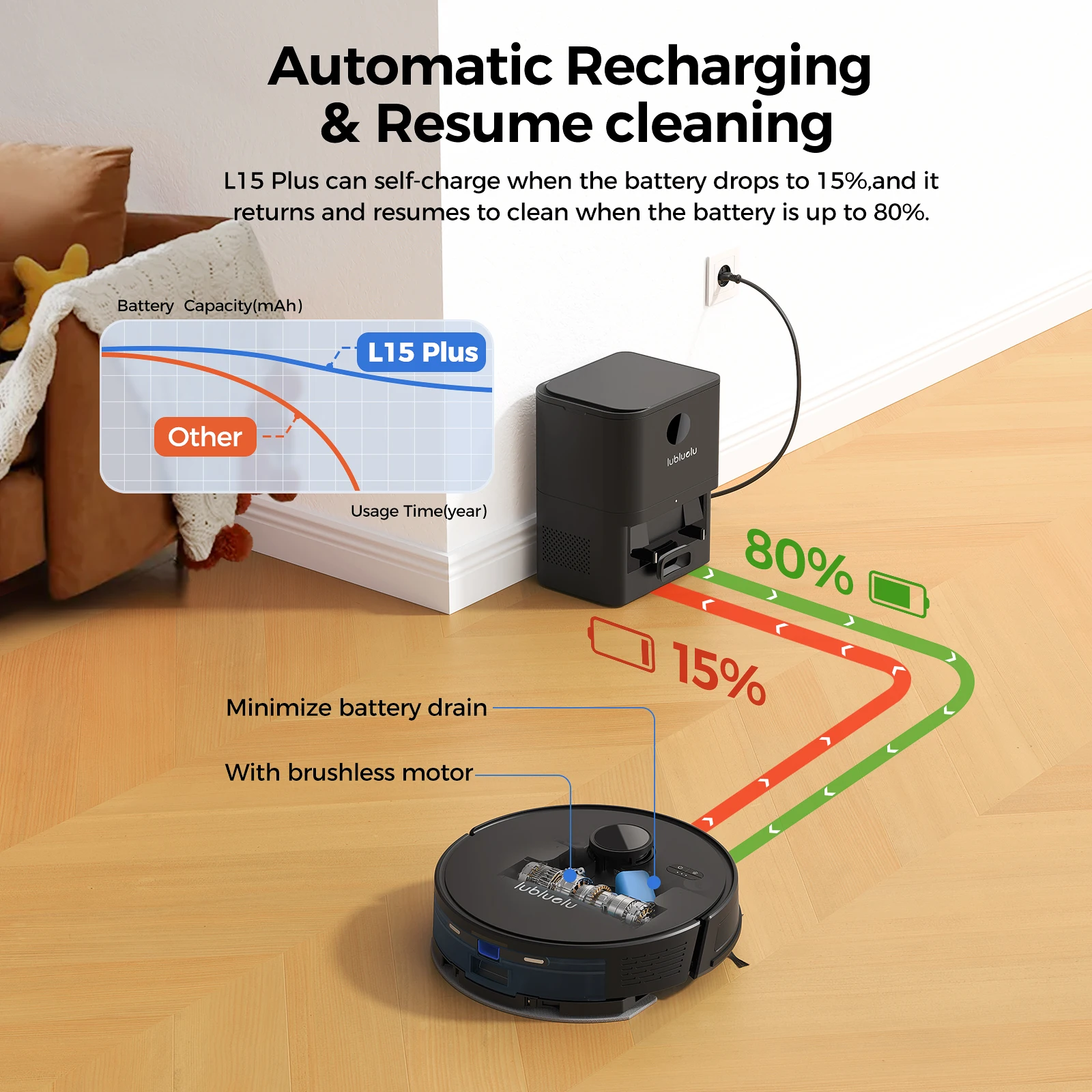 【60 Days Hands-Free Cleaning+HEPA】L15Plus robot vacuums is equipped with 2L auto empty dock that automatically empties the collected dust and debris into an enclosed bag for up to 60 days, and will notify you when the bag is full.Instead of having to manually empty your vacuum.You never have to touch the dustbin contents or release them back into the air. HEPA high-efficiency filters can effectively trap fine dust and allergens.So keep the air in your home fresh, protect your family and baby, perfect for allergy sufferers.