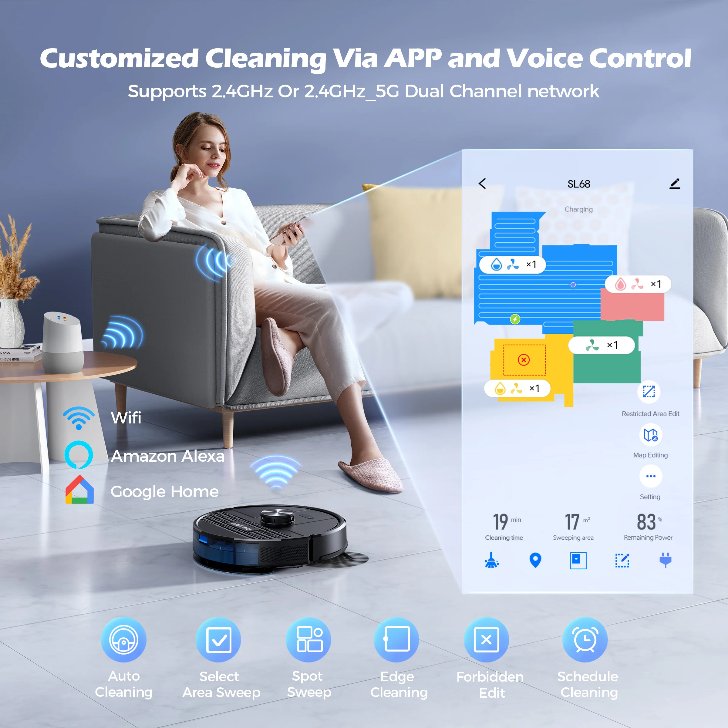 Lubluelu SL68 Robotic Vacuum Cleaner, 4500Pa Suction Power, Self-Charging, Anti-Siphon, 5 Maps, 24 No-Go Zones, Smartphone Compatible, Hard Floor & Carpet Cleaning, Aluminum Material, Wi-Fi Enabled, 2600mAh Lithium Battery, 110V-240V Power Supply