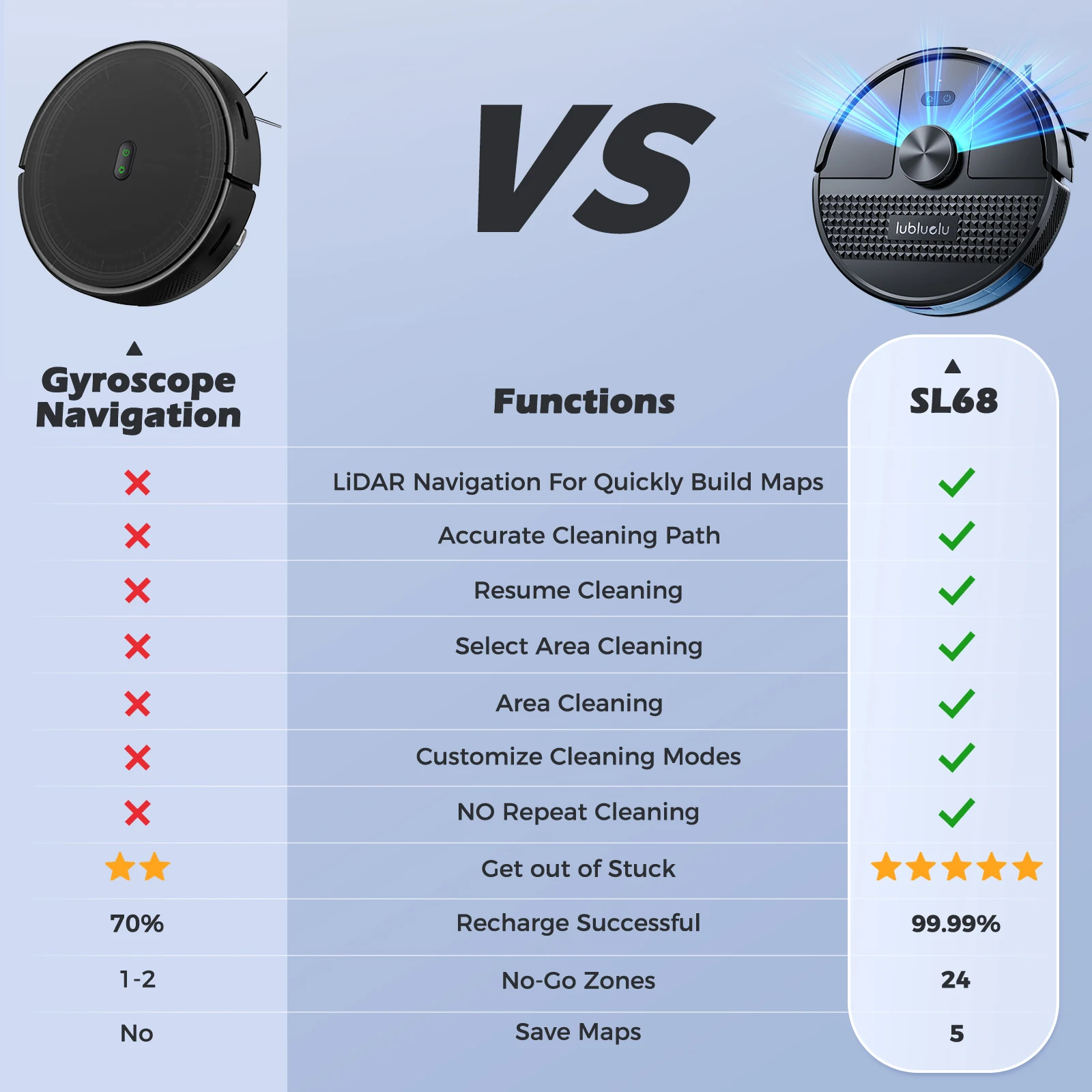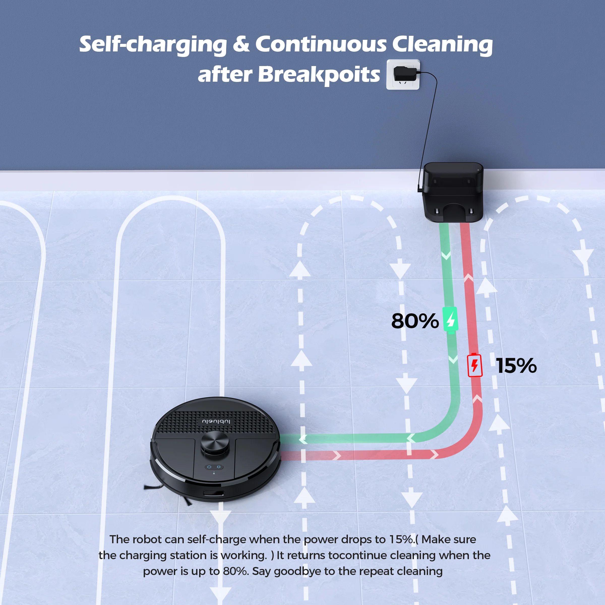 The SL68 robot vacuum and mop combo has a runtime of 150 minutes and auto charging feature. It can operate for 90-150 minutes at various suction settings, covering a maximum cleaning area of 1614 square feet. Our LUBLUELU laboratory’s calculations suggest that battery life may vary in complex home environments. The robotic vacuum will autonomously return to the charging dock when the battery is low. If the cleaning task is unfinished, it will automatically recharge to 80% before resuming.