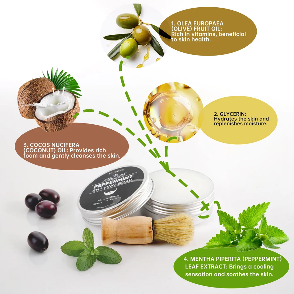 1. Natural Formulation: The mint-scented shaving soap combines high-quality olive oil, glycerin, and coconut oil with natural peppermint leaf essence, creating a mild yet effective shaving soap that cares for your skin without chemical irritants.
