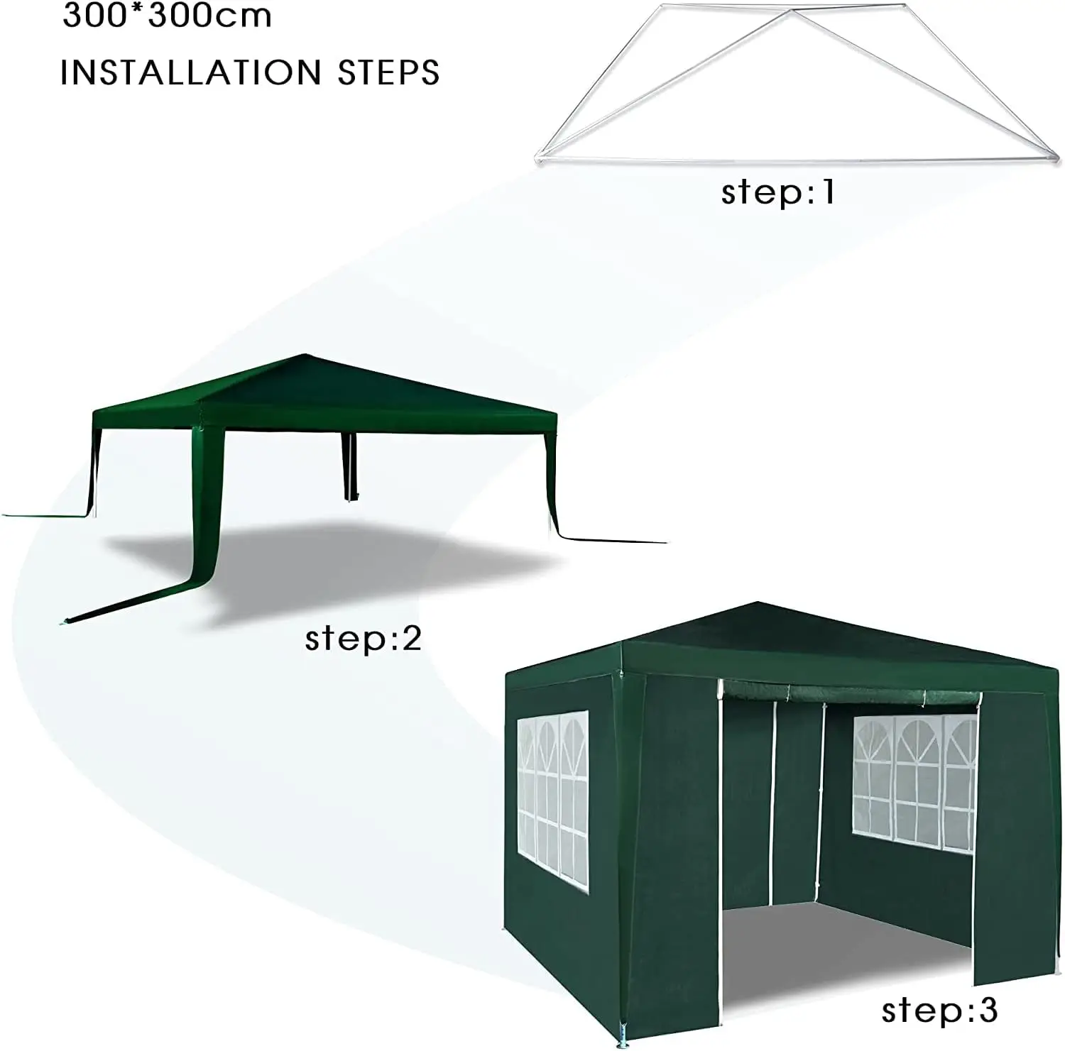 VERSATILE USAGE: The MCC gazebo tent can be easily set up by one or two people without any tools. It is a waterproof tent perfect for wedding, events, open markets, trade shows, a day at the beach or just as a shade on a hot summer day! WATERPROOF & HEATPROOF MATERIAL: The top cover is made from premium PE fabric and waterproof coating, the meticulously sewed cover ensures absolute durability Roof and Sides: PE 100g/m2 waterproof material. Specifications: Gazebo Size: 300*300*255cm 4 REMOVABLE SIDEWALLS: The 4 sidewalls including the zipped doorway are all easily removable to meet all your needs. Upgraded Sturdy Structure: sturdy rustproof powder-coated steel tubes & connectors provide durability and stability. Package Includes: 1 x Frame Set 1 x Canopy Top Cover 4 x sidewalls (2 pcs with window + 2 pcs with zipper) 1 x Set of Stakes & Ropes 1 x Manual Easy to set up: 3 steps to set up Clear manual included Removeable wall sides This product is designed for personal/leisure use – it is not suitable for commercial use We do not take any responsibility for sides, roof or frame when they have broken/been damaged due to wrong set up, and/or if it has been set up in the rain as it buckles the frame by the water weight pressed on the roof. This item should not be left unattended assembled at anytime , it is not recommended to be left up in the wind/ rain AND NEVER leave it unattended , particularly with the roof and side panels on when gust of winds / rain can damage it. We cannot be held responsible for any damage incurred by failing to adhere to the above advice.