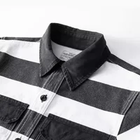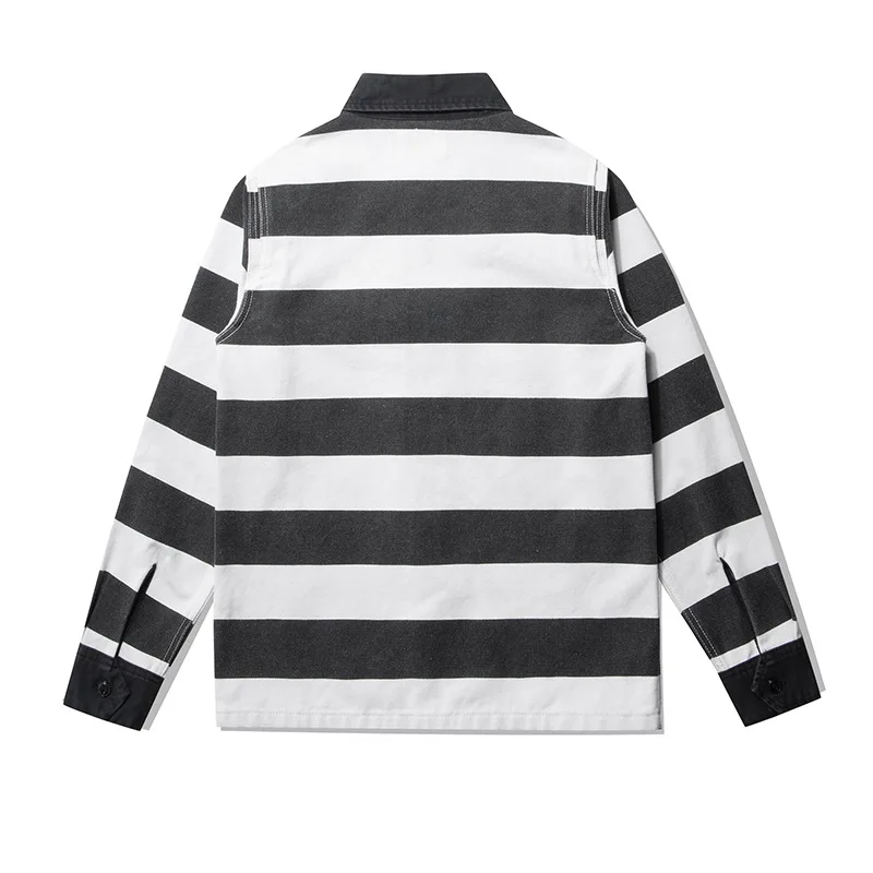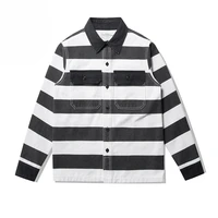 Men’s 16OZ Canvas Jacket Vintage Black White Striped Motorcycle Shirt Cotton Thick Lapel Prisoner Jacket Male Casual Outerwear