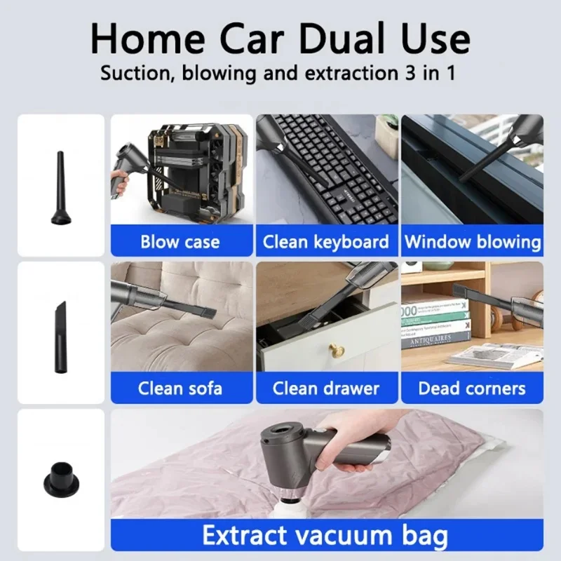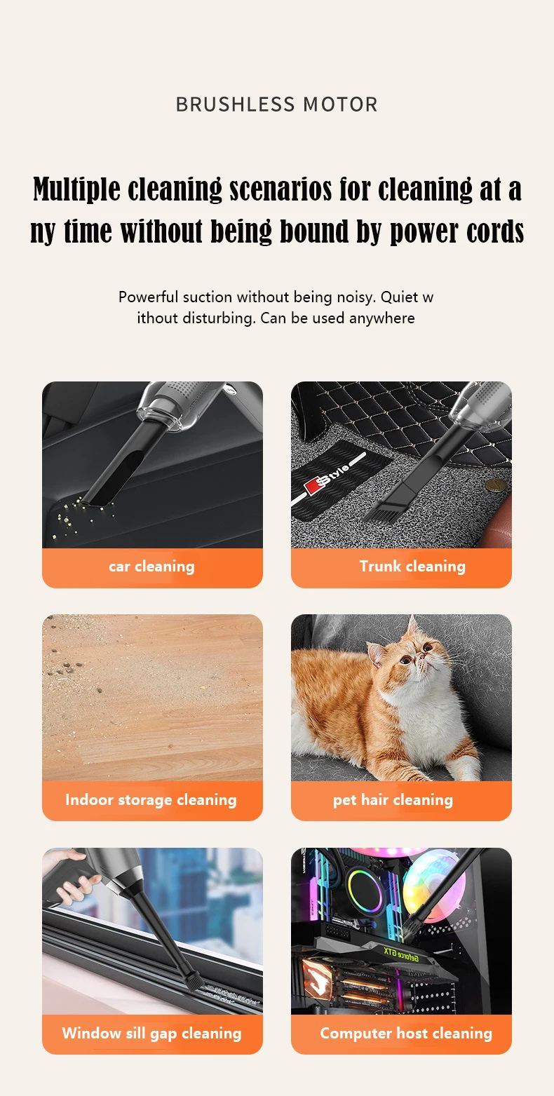 5. Various scenarios for cleaning at any time: car cleaning, trunk cleaning, indoor storage cleaning, pet hair cleaning, window sill gap cleaning, computer host cleaning