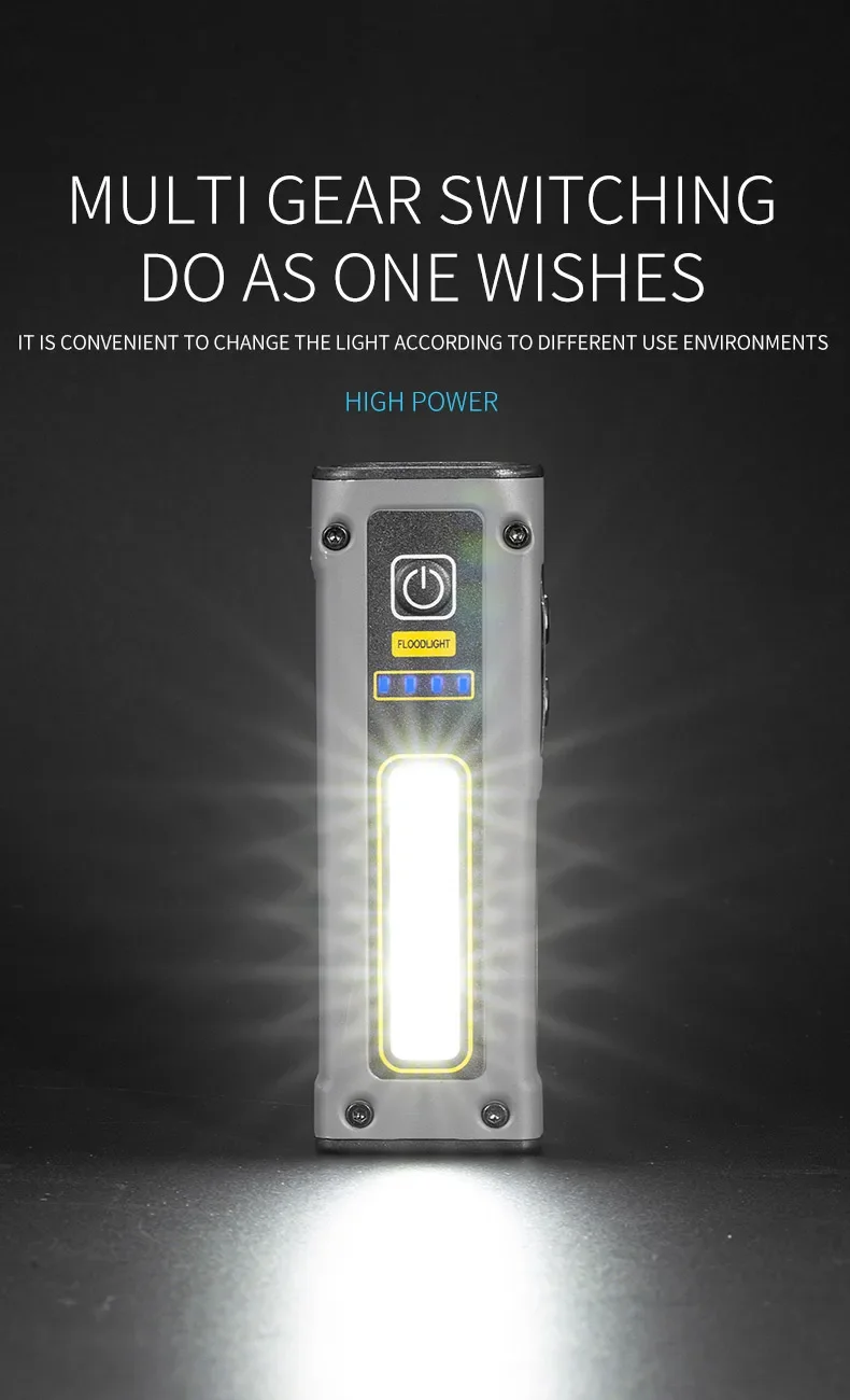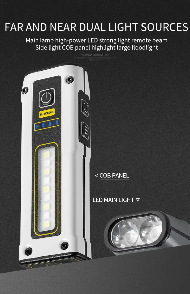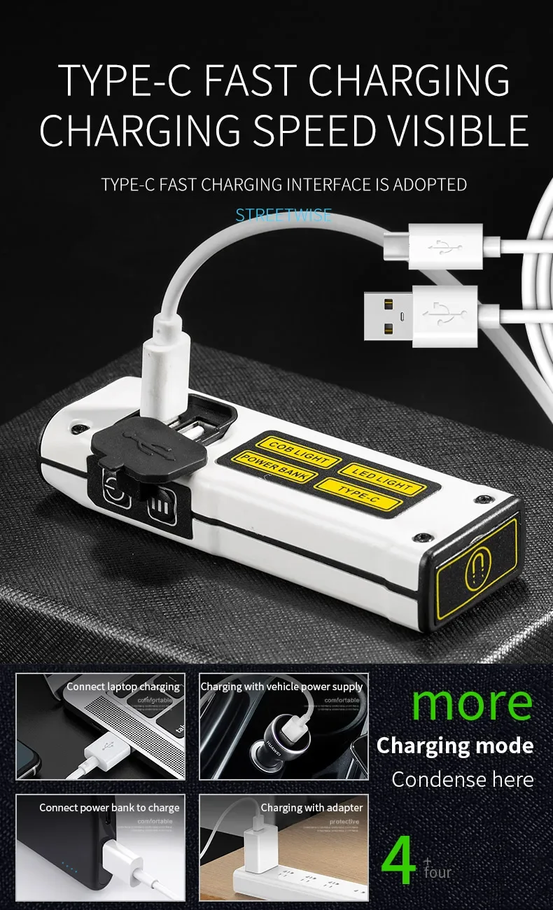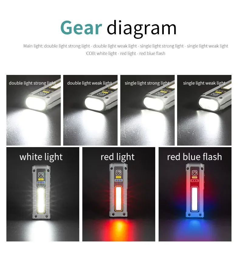 This is a dual light strong flashlight, remind mini, carry around suitable for a variety of occasions. With a variety of functions, such as tail has strong magnetic adsorption function, Type-c fast charging and power bank function, mobile phone can be charged