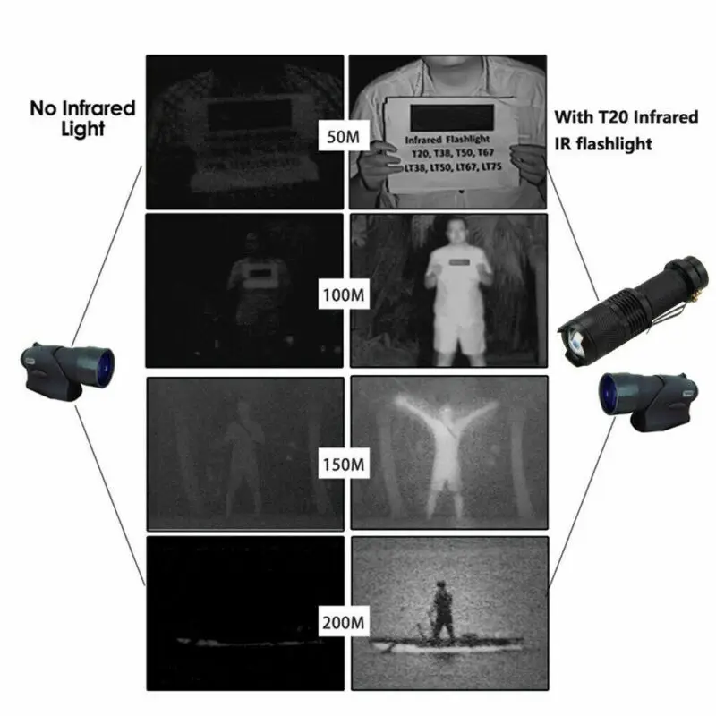 INVISIBLE IR LIGHT: You won’t see any light with your bare eyes (The LED chip from this flashlight turns red by naked eyes when the light on ),however the light beam need to be detected by night vision scopes or non-IR filter cameras