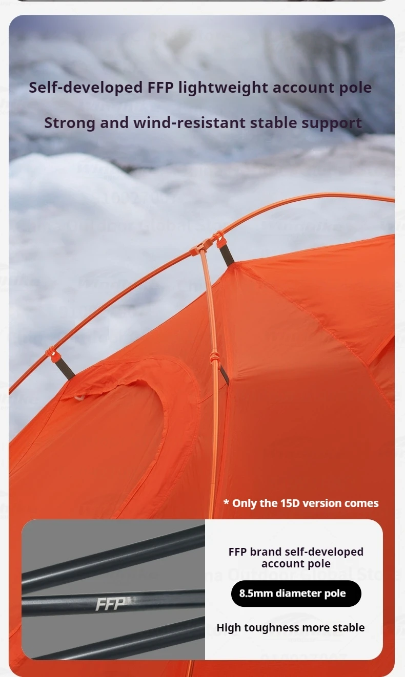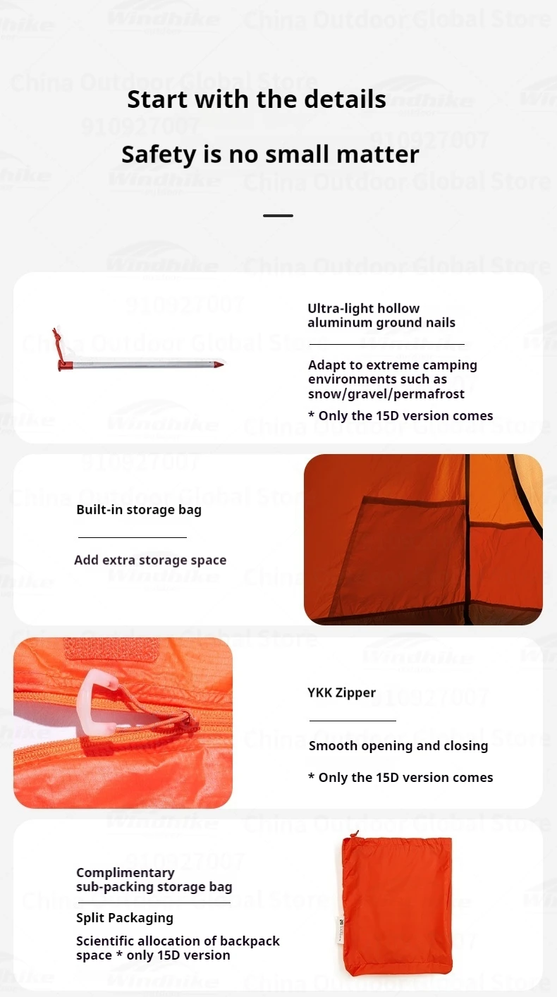 • Tent Bottom: 20D 410T Double Lattice Nylon(PU4000mm, Silicone Coated)