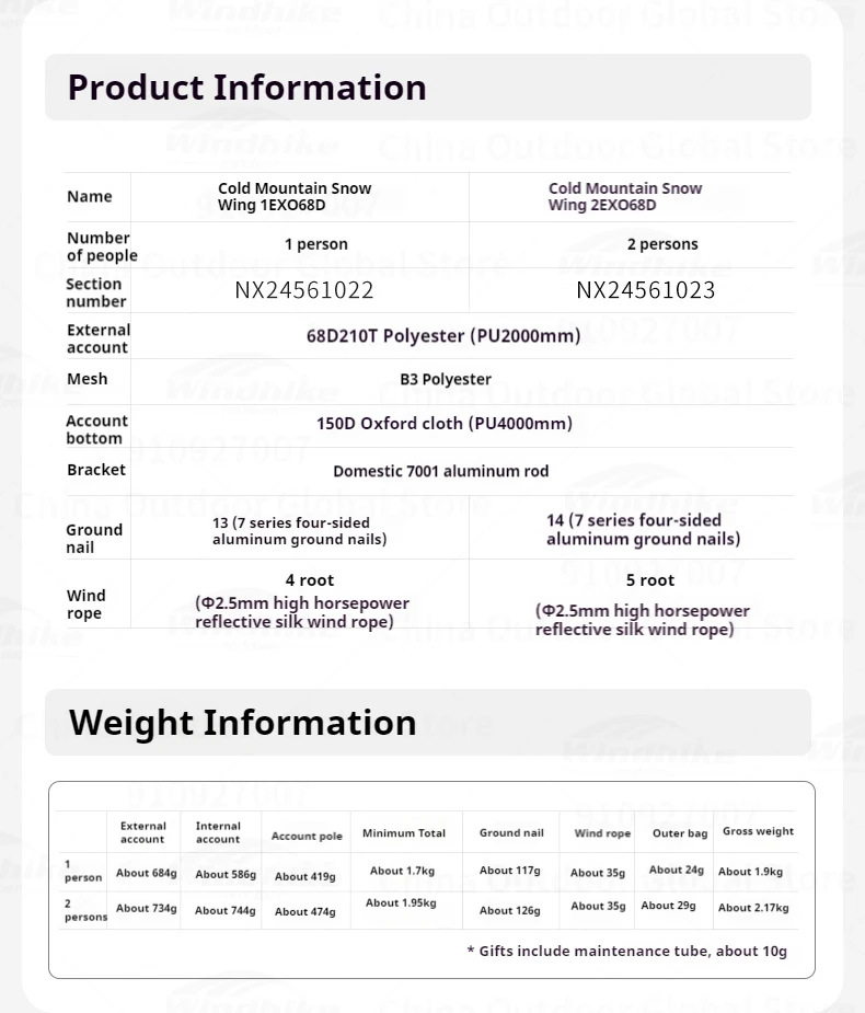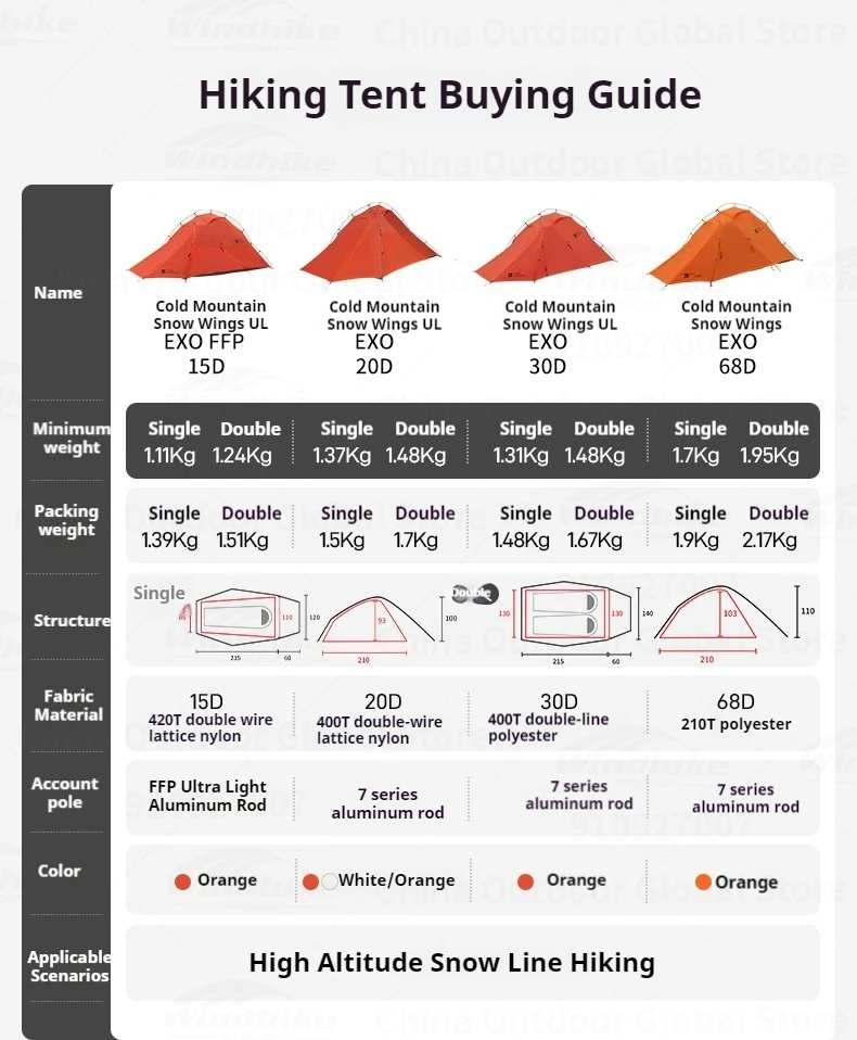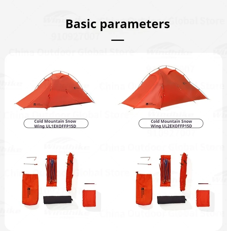 • External Tent: 15D 420T Nylon, Double Wire Lattice(PU2000mm, Silicone Coated)