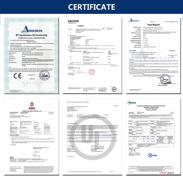 A: We have CCC, CE (EN71, EN14765), SGS, ISO9001 etc. Also we can apply any certificate if you need if the qty is OK.