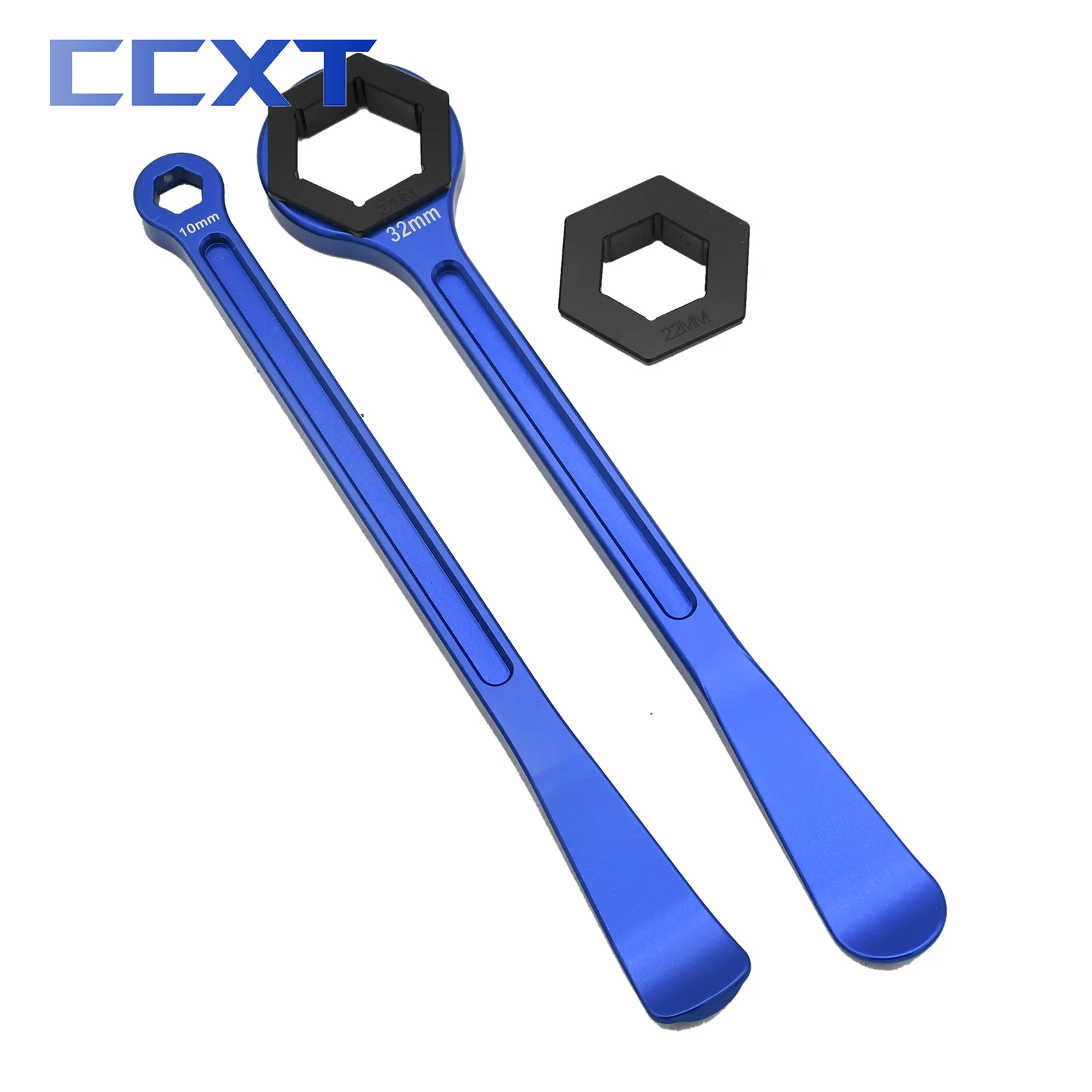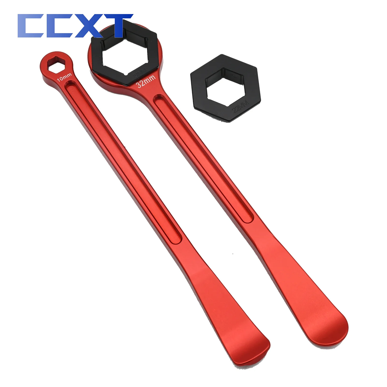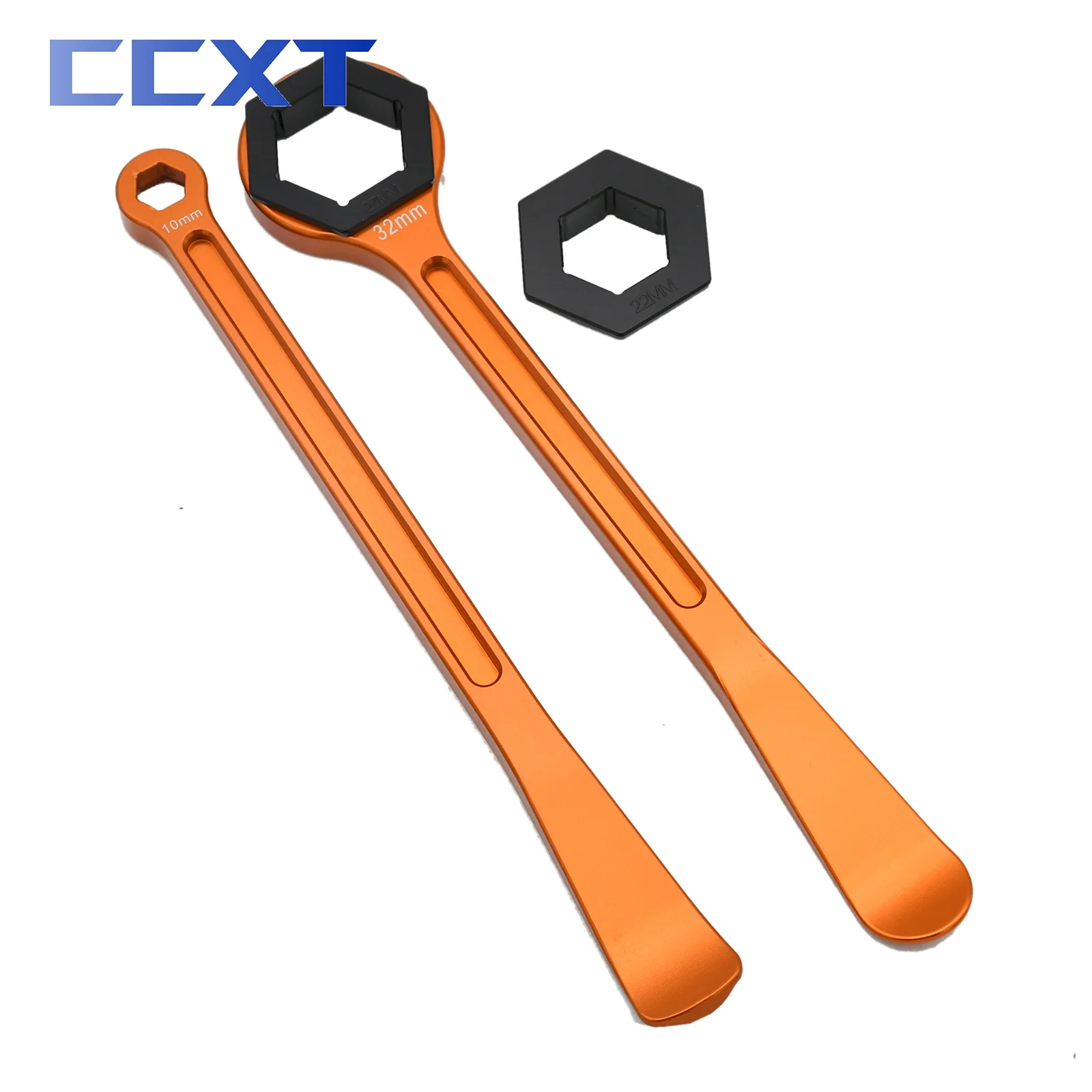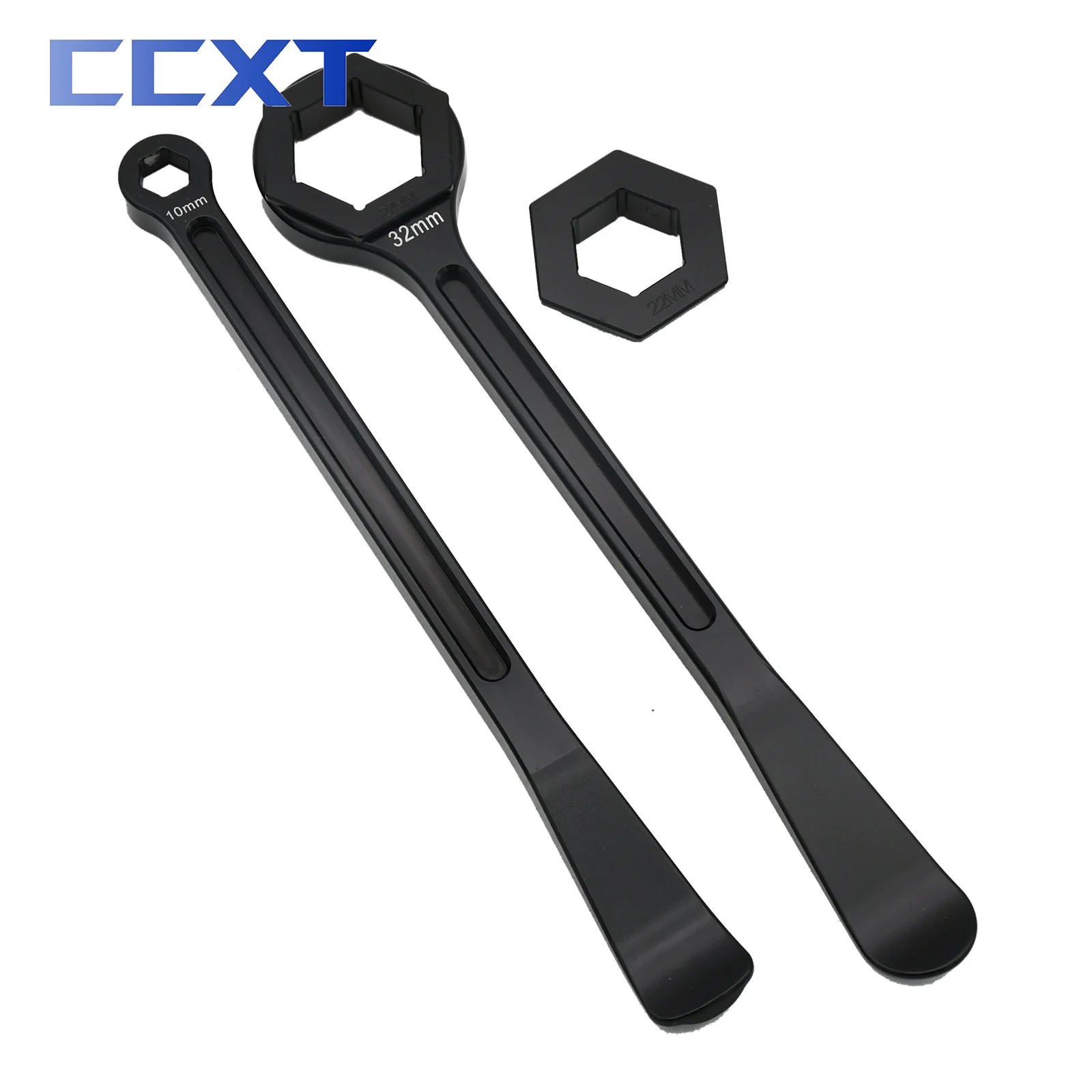 –Second wrench has hex box wrench for 32 mm axle nuts on other end