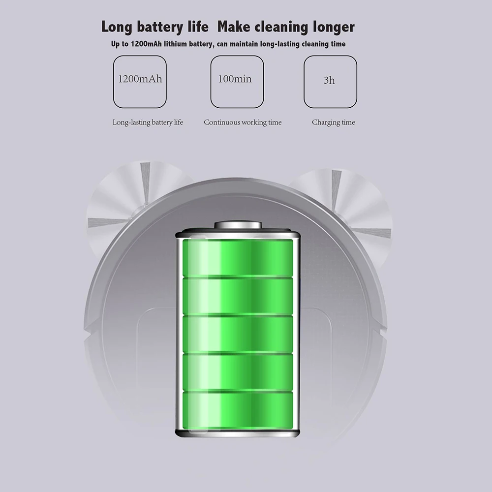 3. Lightweight body, easy to shuttle through the bottom of furniture. Long battery life, making cleaning more durable. Up to 1200mAh lithium battery, able to maintain long-lasting cleaning time. Charging for 3 hours, 30 minutes continuous working time