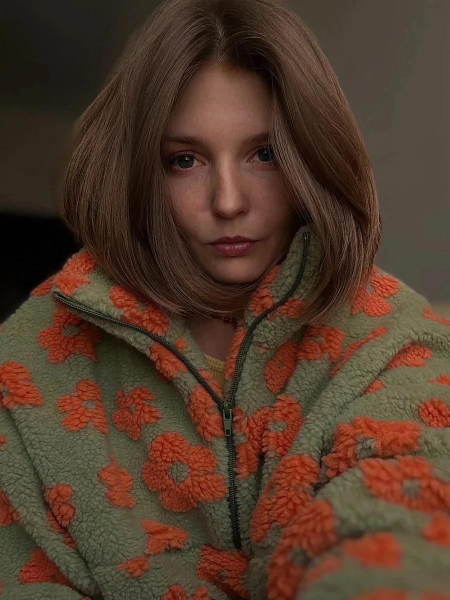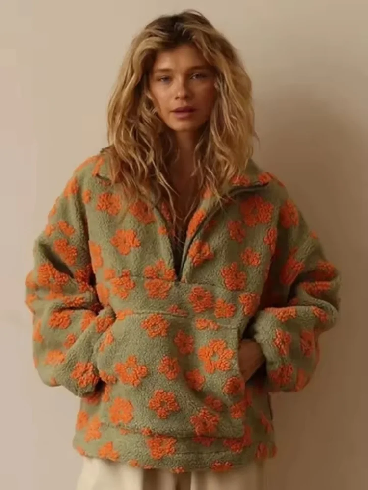 New Autumn Winter Women’s Sherpa Floral Casual Pullover Hoodies Half Zip Style Loose Warm Fleece Lining Sweatshirt