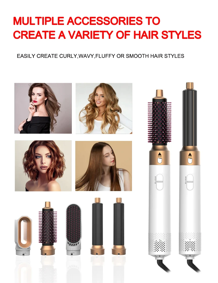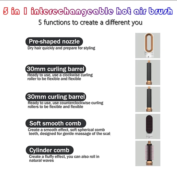 【5 IN 1 Hair Dryer Styling Tool】 The hot air brush dryer for women comes with five interchangeable brush attachments that make straightening, curling, volumizing, and scalp massaging a breeze. Combining blow drying with styling brushes, can fit different hair lengths and create different styles.