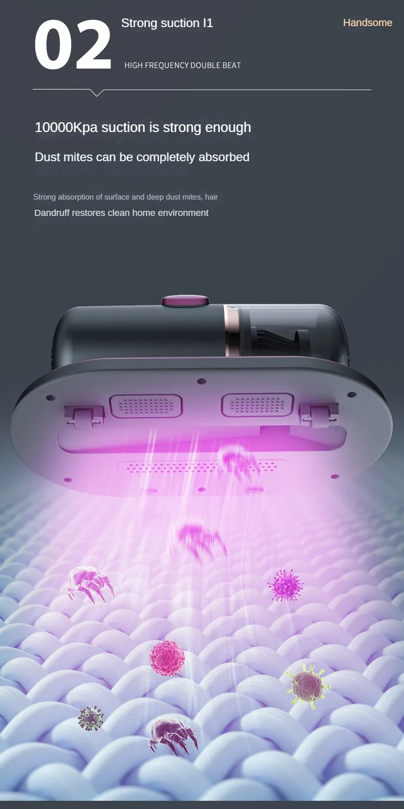 2.Faster & Cleaner: The dust mite vacuum can generate an ultra-strong suction to suck out the dirt, bacteria and mites, leaving not a trace of them.