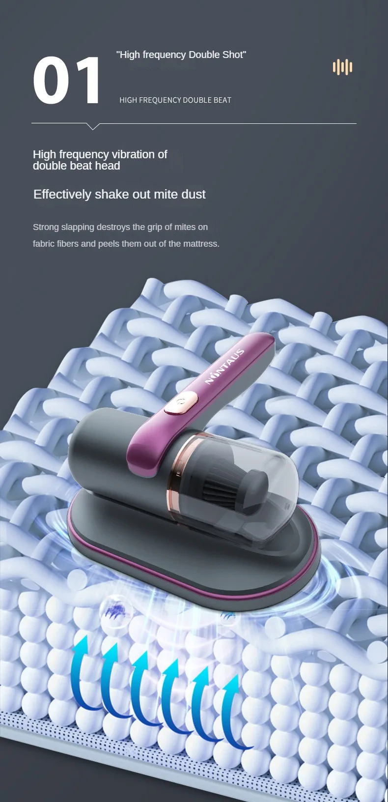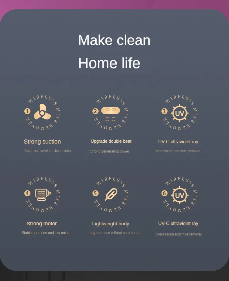 1.Removes Dust Mite Matters with light: The bed mites collector can emit light of 253.7mm. It is a light that can penetrate mites directly and effectively destroy their DNA structure, thus killing them of 99.99%.