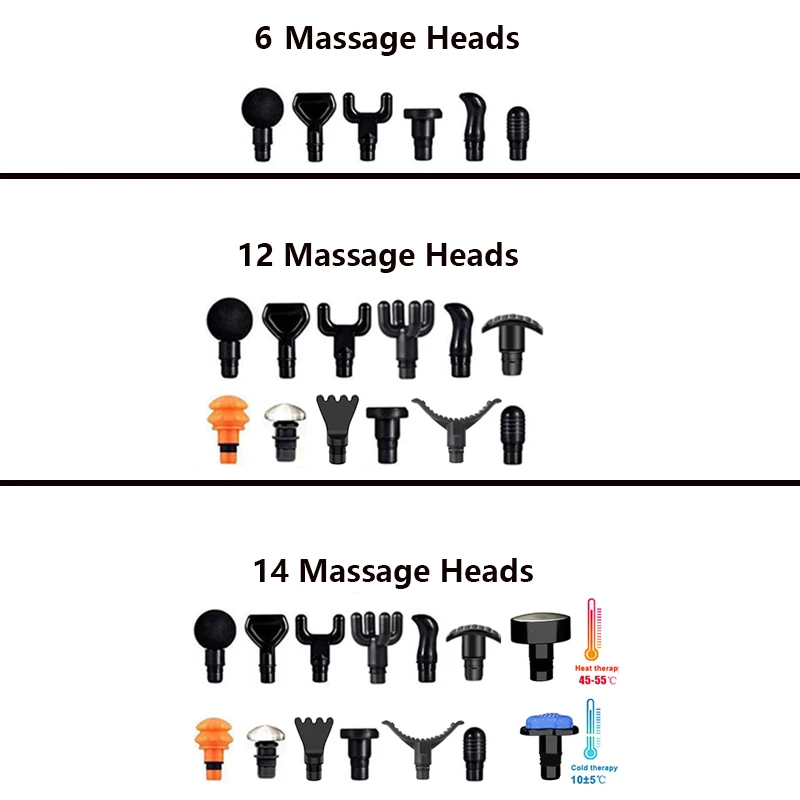 Package include: Quality storage bag, US/ EU/ UK/ AU charging plug, 6 / 12 / 14 professional massage Heads, massage gun, and owner’s manual.