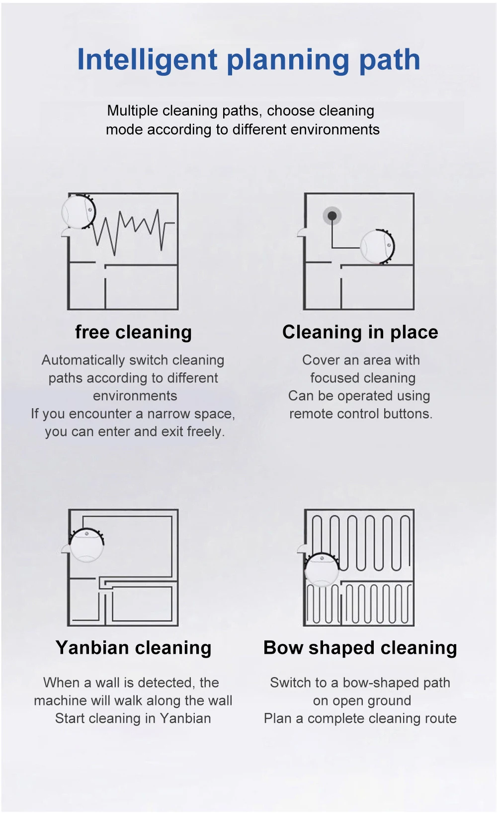 5.Multiple cleaning patterns: Random,Fixed point,Zigzag,Edge cleaning
