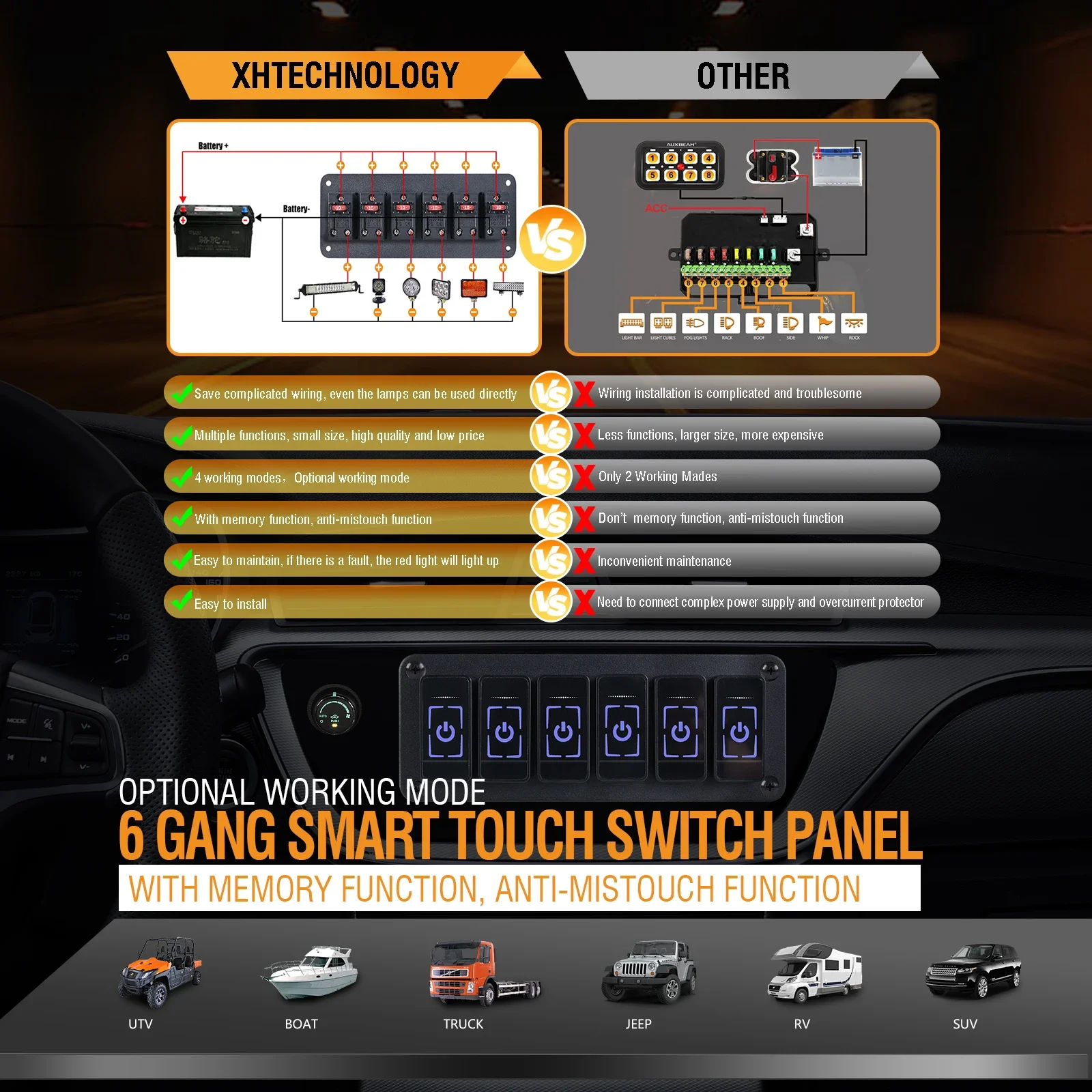 【WIDE USE】: Simple and beautiful design, the smart touch switch panel is suitable for most devices. Such as cars, trucks, marine boats, yachts, trailers, motorhomes, caravans, campers, buses, UTV/ATV and other 12-24V applications. Compact structure, does not occupy installation space.