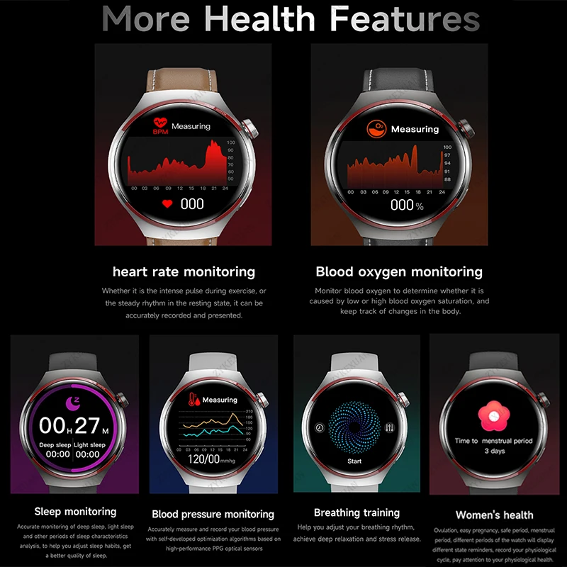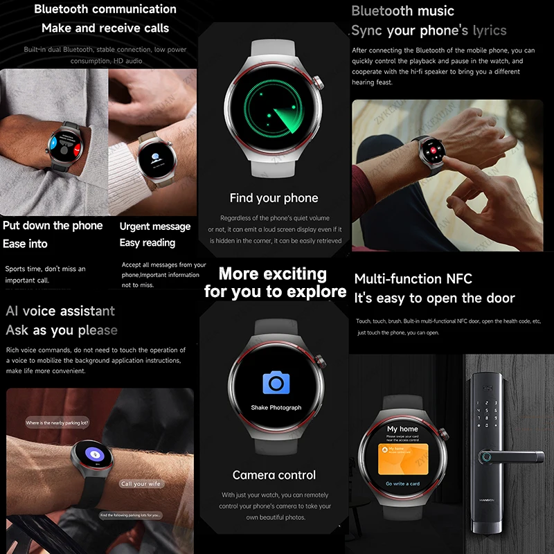Dear customer, thank you very much for your support, this is a multifunctional smart watch! This product has many very useful features! For example, with the NFC function, you can open the door through your watch! Bluetooth calling function, you can make calls directly after connecting to the Bluetooth of your mobile phone! AI voice assistant function, enable watch functions through voice! The sports mode function can monitor your exercise time, distance, steps, calorie consumption, heart rate changes, etc. in real time! There are also some medical functions that can monitor body temperature, sleep, blood pressure, blood oxygen, and heart rate to keep an eye on your health! These are very useful features!
