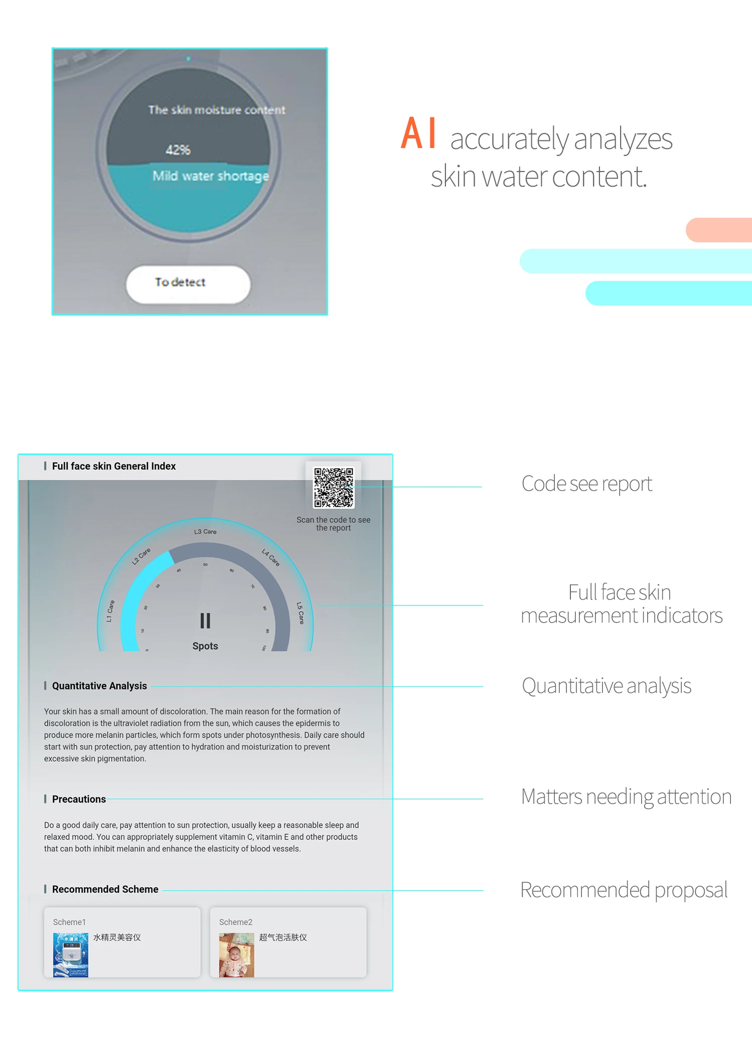 2. Skin evaluation module, including wrinkles, spots, pores, moisture, elasticity, texture, acne