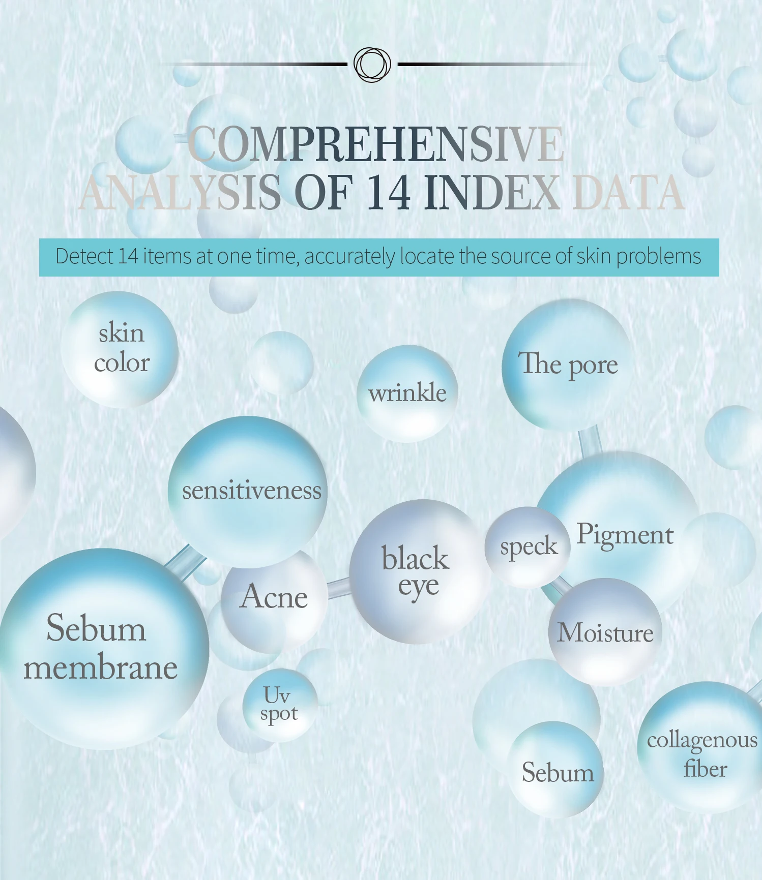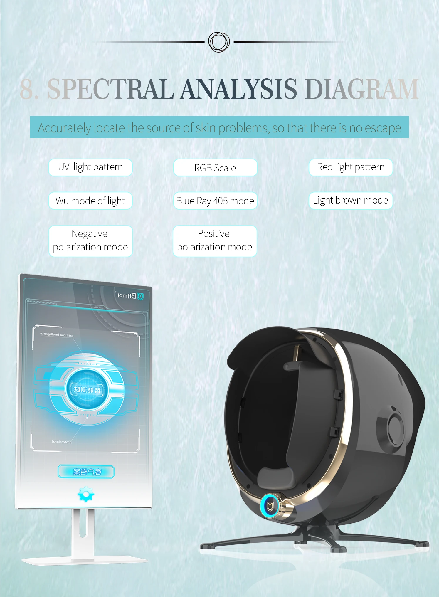 1. 8 spectral imaging (RGB white light, positive polarized light, negative polarized light, UV365, light, blue light 405, red light, brown light, skin comprehensive analysis of 14 skin indicators)