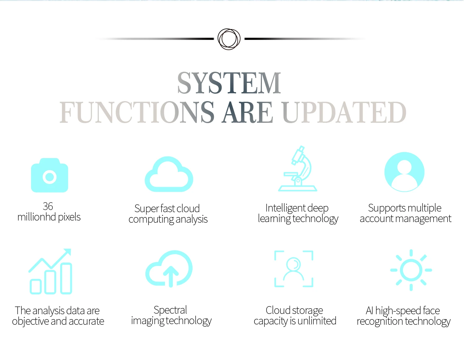 5. In-depth self-study (a comprehensive large-scale database mark that can accurately identify and analyze various skin types)6. 3D simulation technology (3D simulation accurately recognizes facial features, quantitatively analyzes four problematic skins, and a high-tech intelligent skin management system with deep self-learning technology)