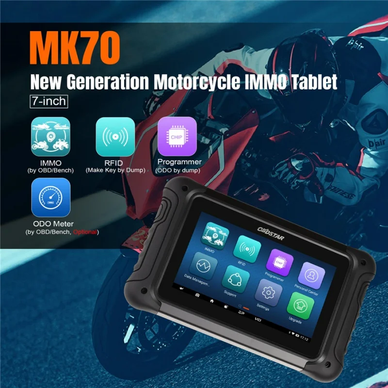 OBDSTAR MK70 is a new generation of motorcycle immobilizer programming device for locksmiths with powerful help data files. It is an easy-to-use and portable 7-inch tablet, based on the RK3128 quad-core Samsung Exynos processor.