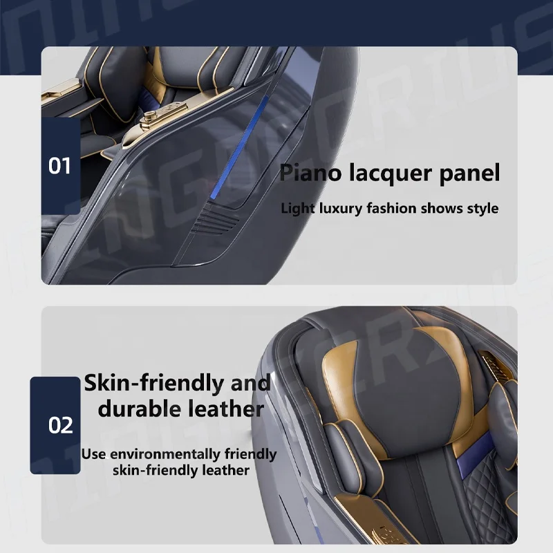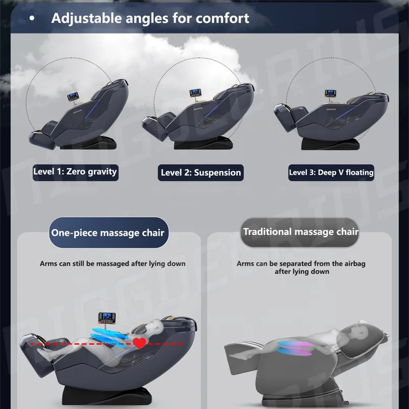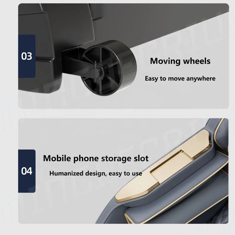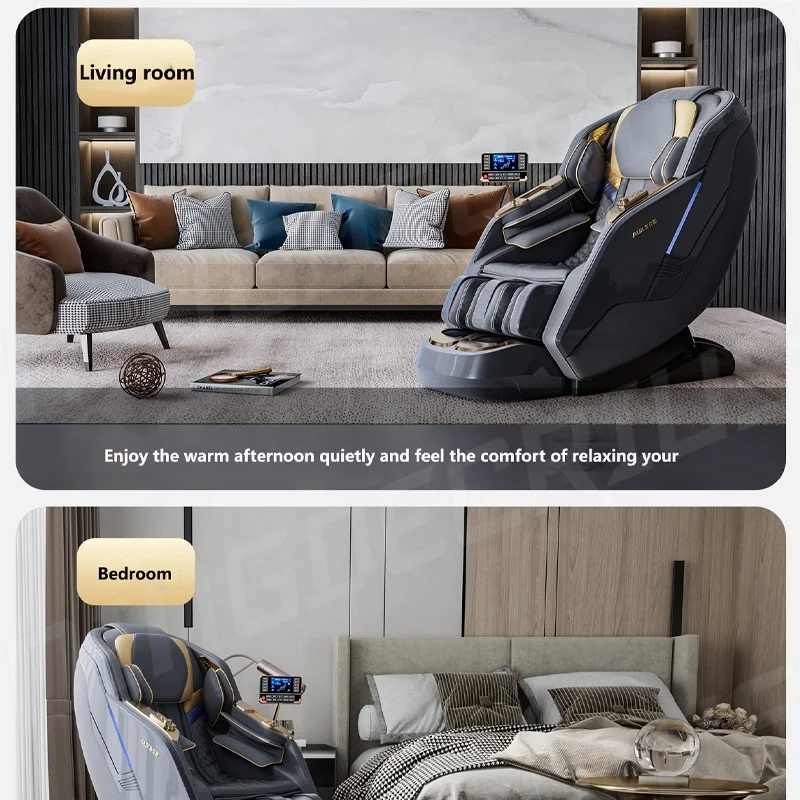 Function description: 1. Front and back telescopic 13cm 4D manipulator, SL guide rail, can realize kneading, shiatsu, slap, kneading hammer synchronization and other massage techniques. 2. 3 control modes 3. Warm back function, temperature 30-45 degrees adjustable; 4. Shoulder extrusion massage with 4 air bags; Arm double row big air bag wave massage; Legs full package air bag extrusion massage; Leg air bag left and right swing function; Ankle projection massage function; Waist cushion large air bag squeeze wrap rocking type massage. 5. Plantar roller scraping massage, electric intelligent detection of telescopic legs; Leg strap kneading function. 6. Double electric push rod design, not only can realize linkage lifting, leg lifting can be independently controlled, one-button zero gravity function, HIFI Bluetooth music. 7.10 speed automatic and 6 speed manual program.