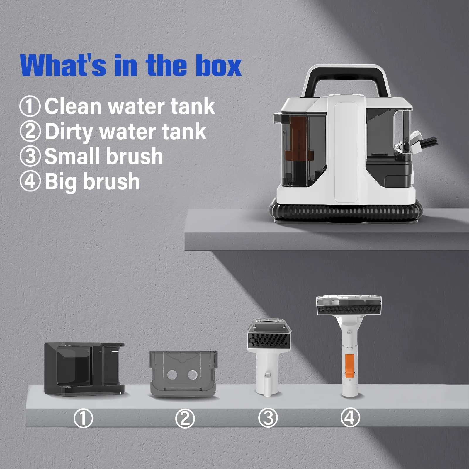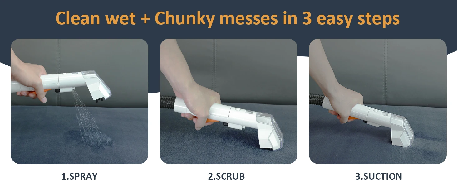 💦 Spray, Scrub & Suction in One – Integrated system sprays cleaning solution, agitates fibers, and instantly sucks away grime for a spotless finish.