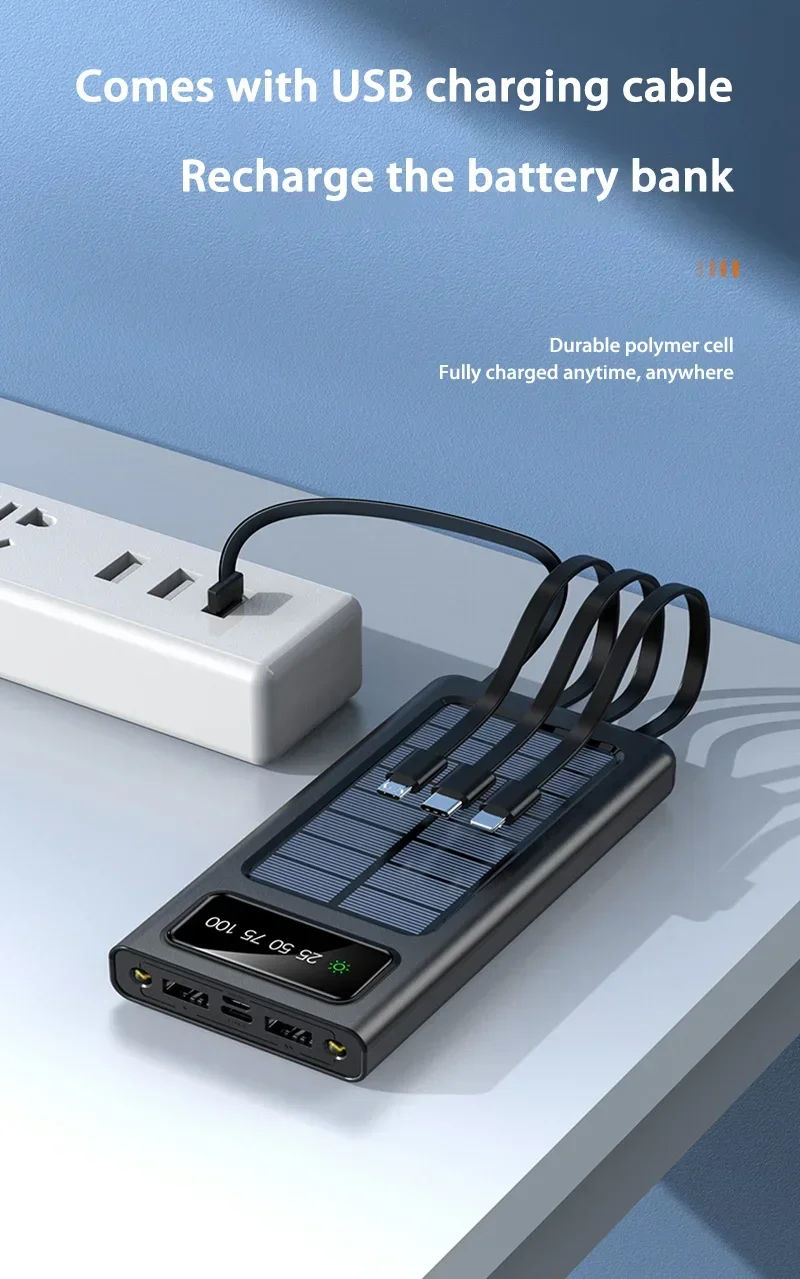 ⭐ Travel companion, 200000mAh solar power bank, comes with 4 wires, can be charged when there is light