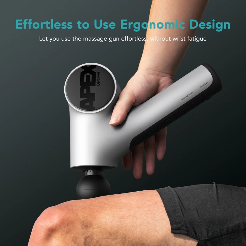 Effortless to Use– Opove Apex massage gun with 45º holding angle design, the center is just where you hold it, that let you use the massage gun effortless, without wrist fatigue; the weight of the product itself is well converted into pushing force during use, allowing you to use the massage gun easily.