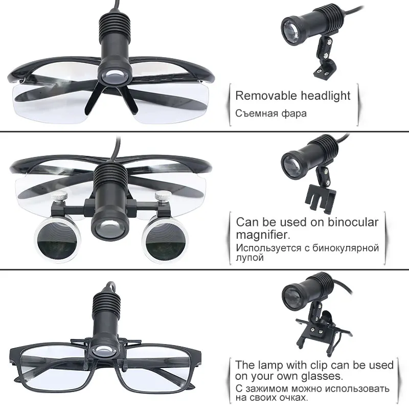 3. Head lamp with eyeglass clip can be used on your own glasses.