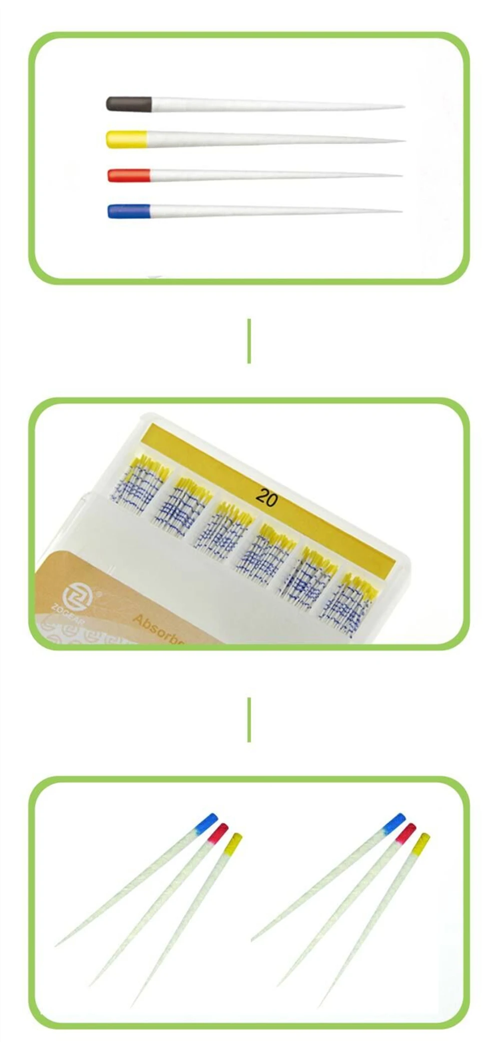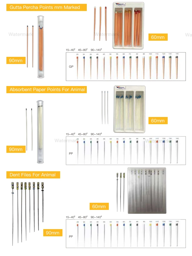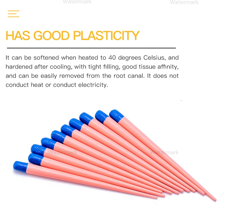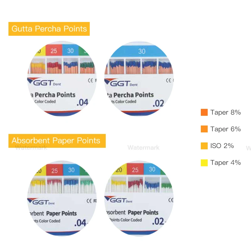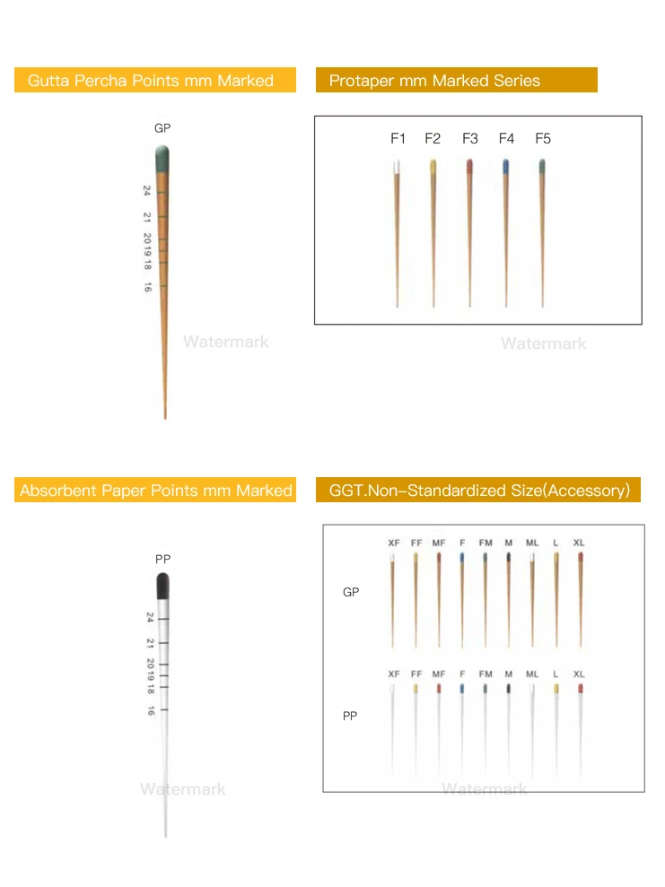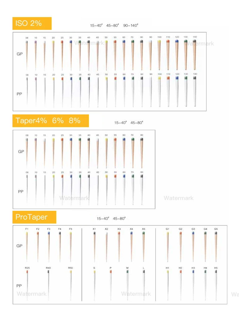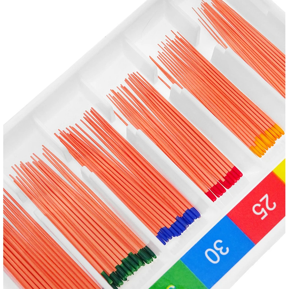 Different types of gutta-percha tips are identified according to the color of the top. The gutta-percha tips with scales are convenient for cutting, filling, X-ray blocking, easy to confirm the filling effect, hard and tough, can be easily filled to the root tip, accurate size.