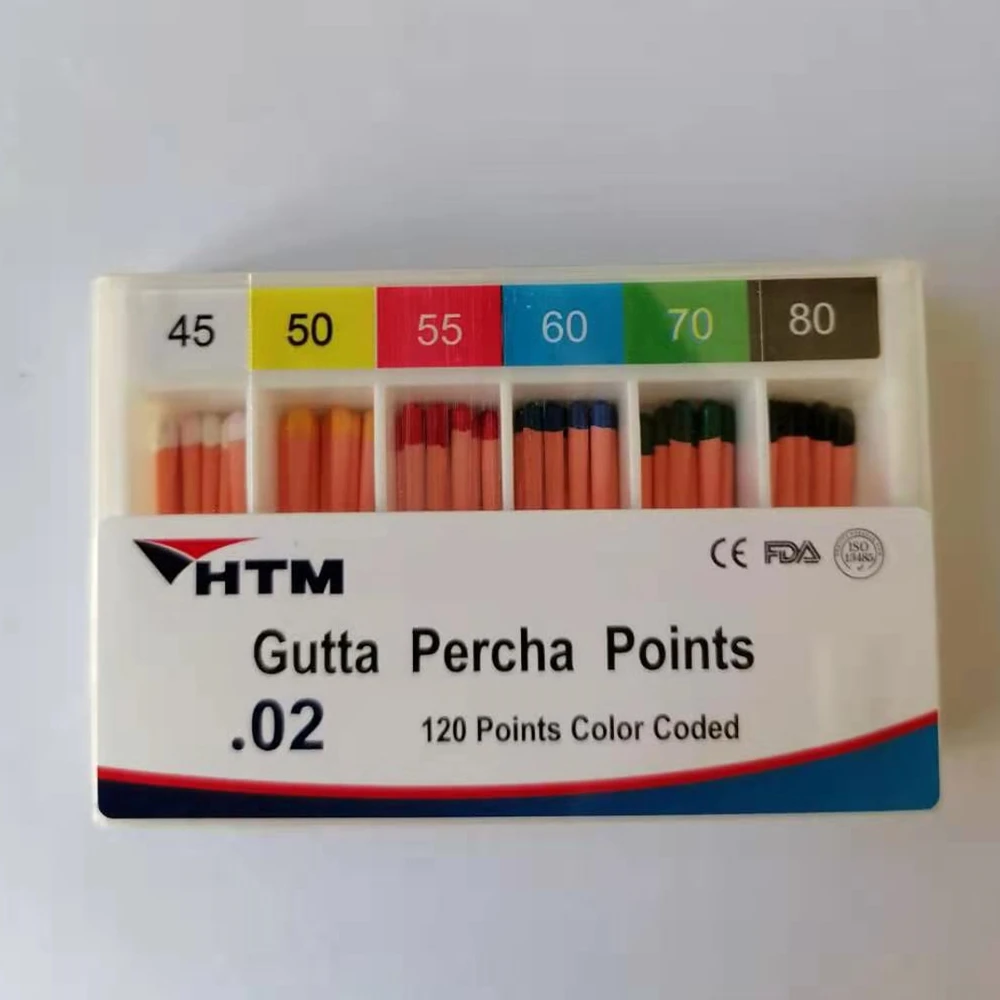 Different types of gutta-percha tips are identified according to the color of the top. The gutta-percha tips with scales are convenient for cutting, filling, X-ray blocking, easy to confirm the filling effect, hard and tough, can be easily filled to the root tip, accurate size.