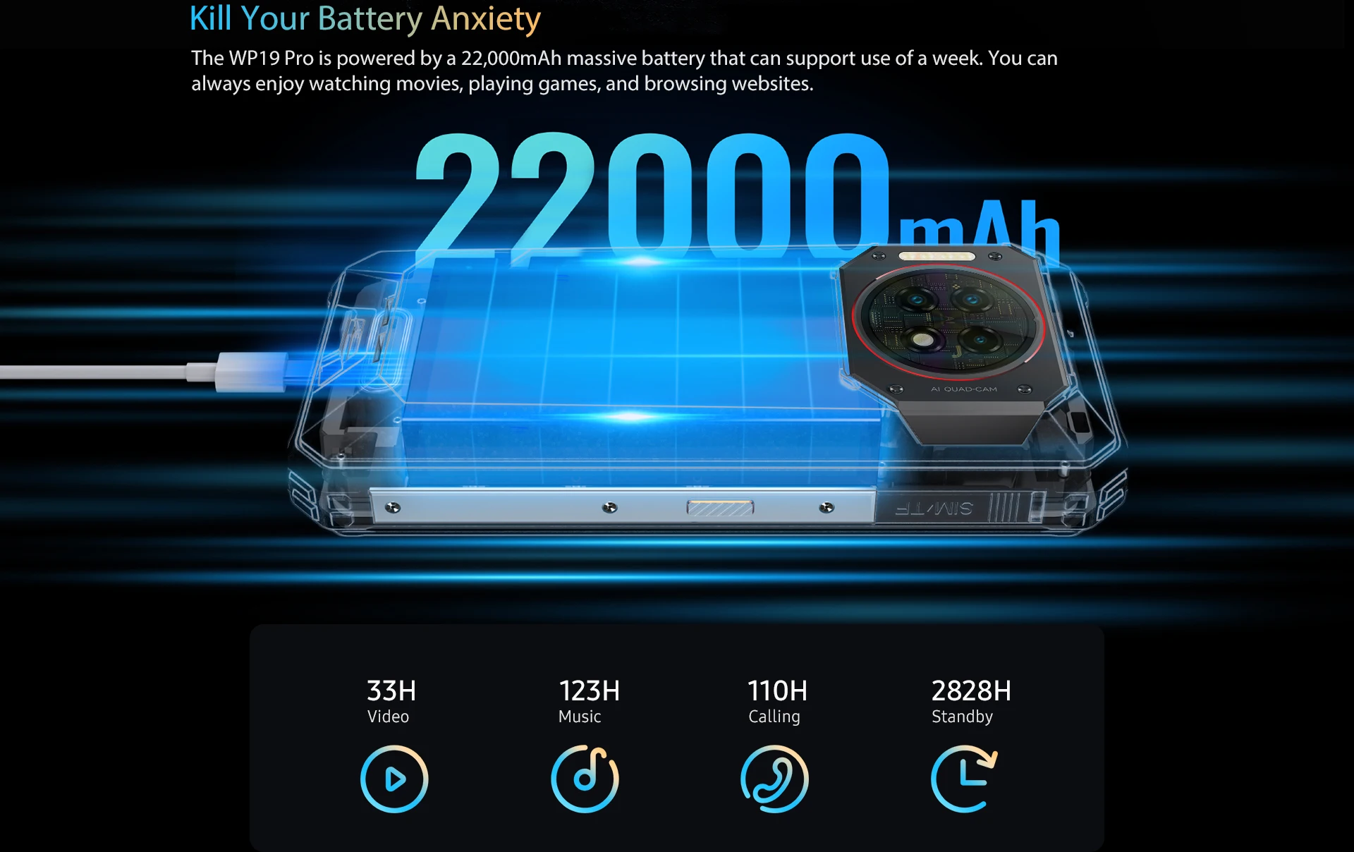The WP19 Pro is powered by a 22,000mAh massive battery that can support use of a week. You can always enjoy watching movies, playing games, and browsing websites.