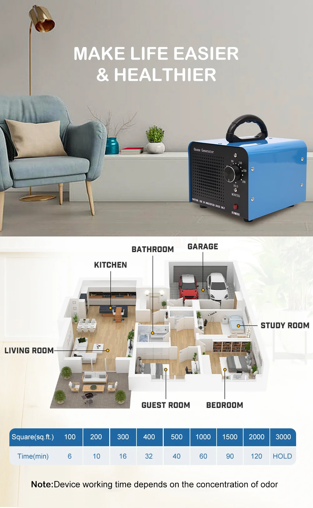 ✅ More Powerful – The Ozone generator has a max output of 10000-30000 mg/h suitable for 2500 sqft space. The Ozone output is more stable, the efficiency is 50% higher than ordinary Ozone machine.