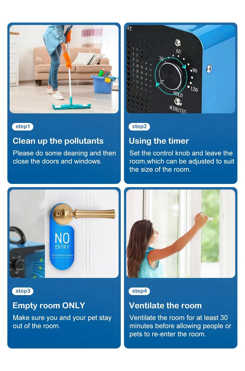 ✅ Easy to use – Just turn the timer to work, the max time is 180 mins. After stop working, please ventilate for 30 mins before entering the space again. Note: In the "HOLD" mode, the machine continues to work and needs to be used with a remote switch.