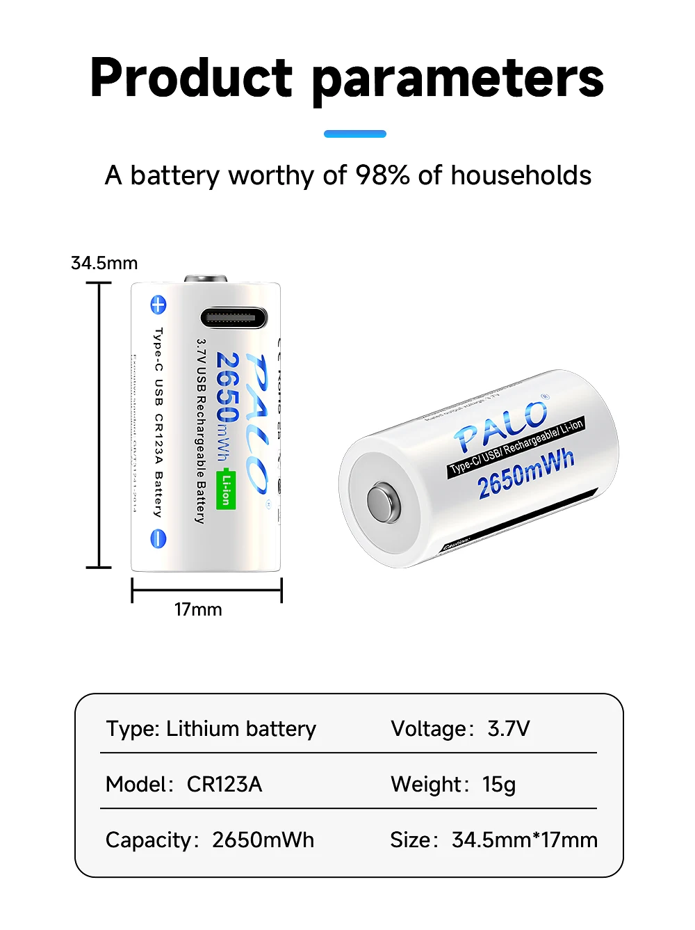Be the first to review “PALO 2-12PCS 2650mWh 3.7V 16340 16350 Rechargeable Battery USB Charging RCR123 CR123 CR123A Li-ion Batteries for LED Flashlight”