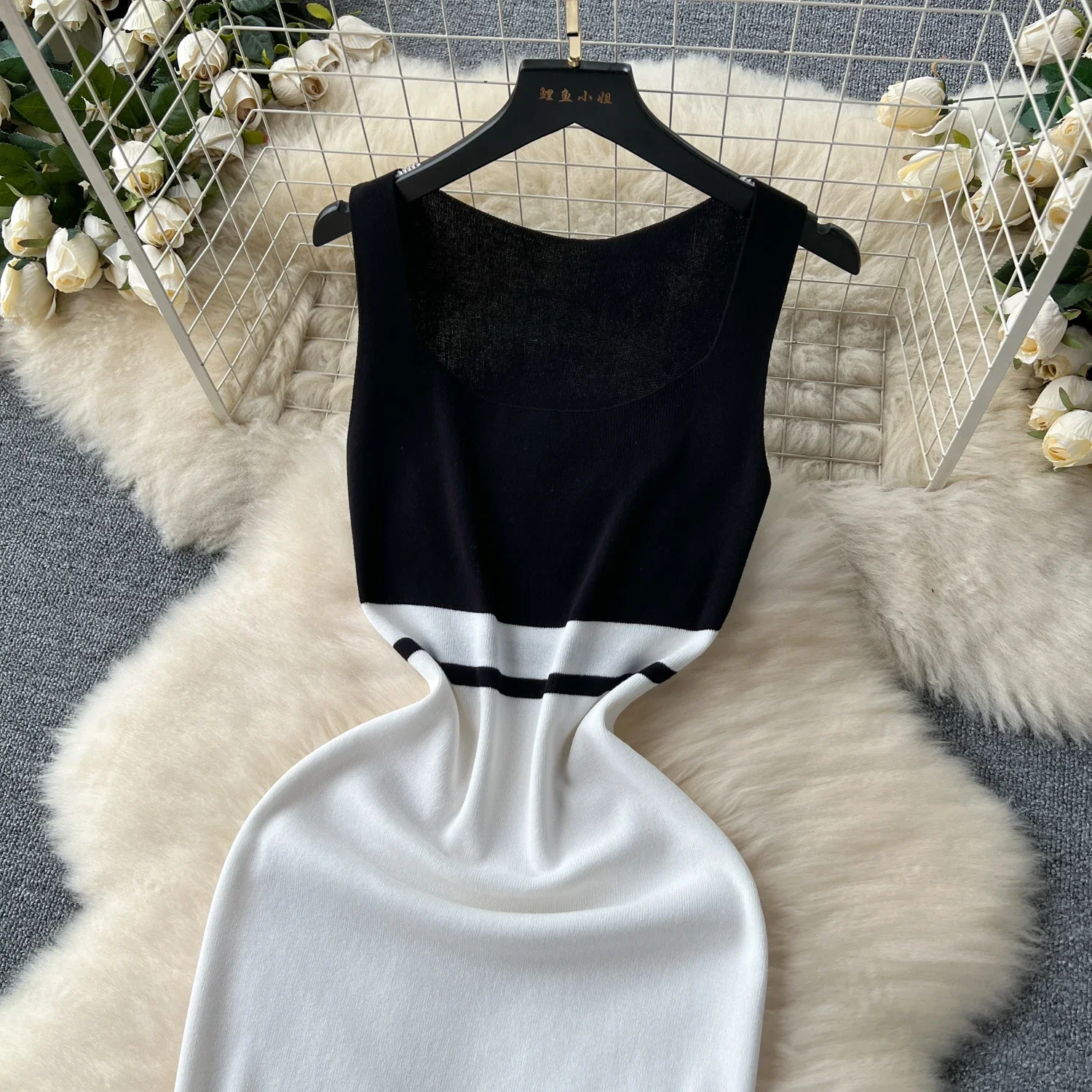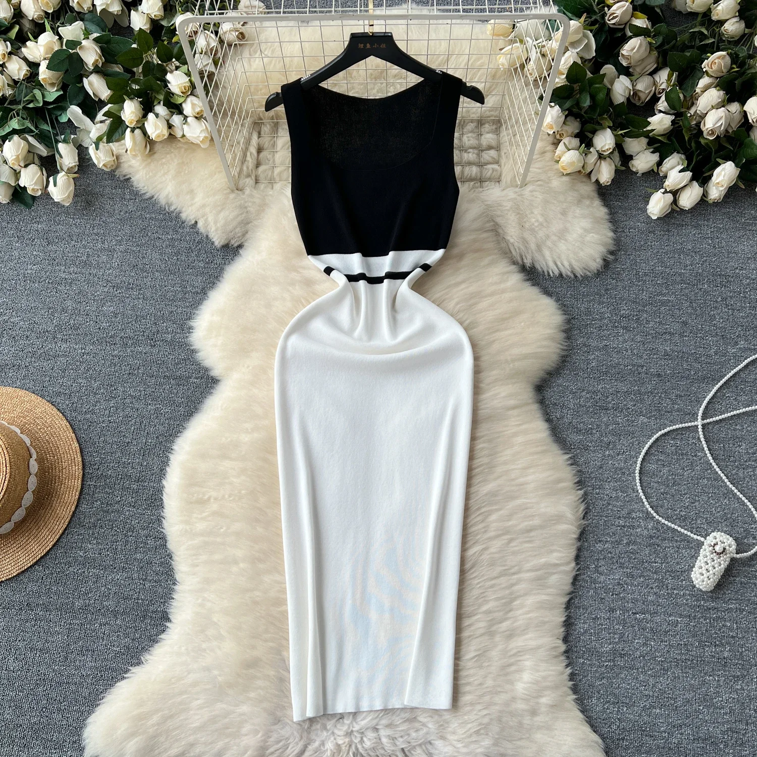 Patchwork Knit Bodycon Dress Women Maxi Dress Elastic Summer Elegant Sleeveless Dress Fashion Dresses